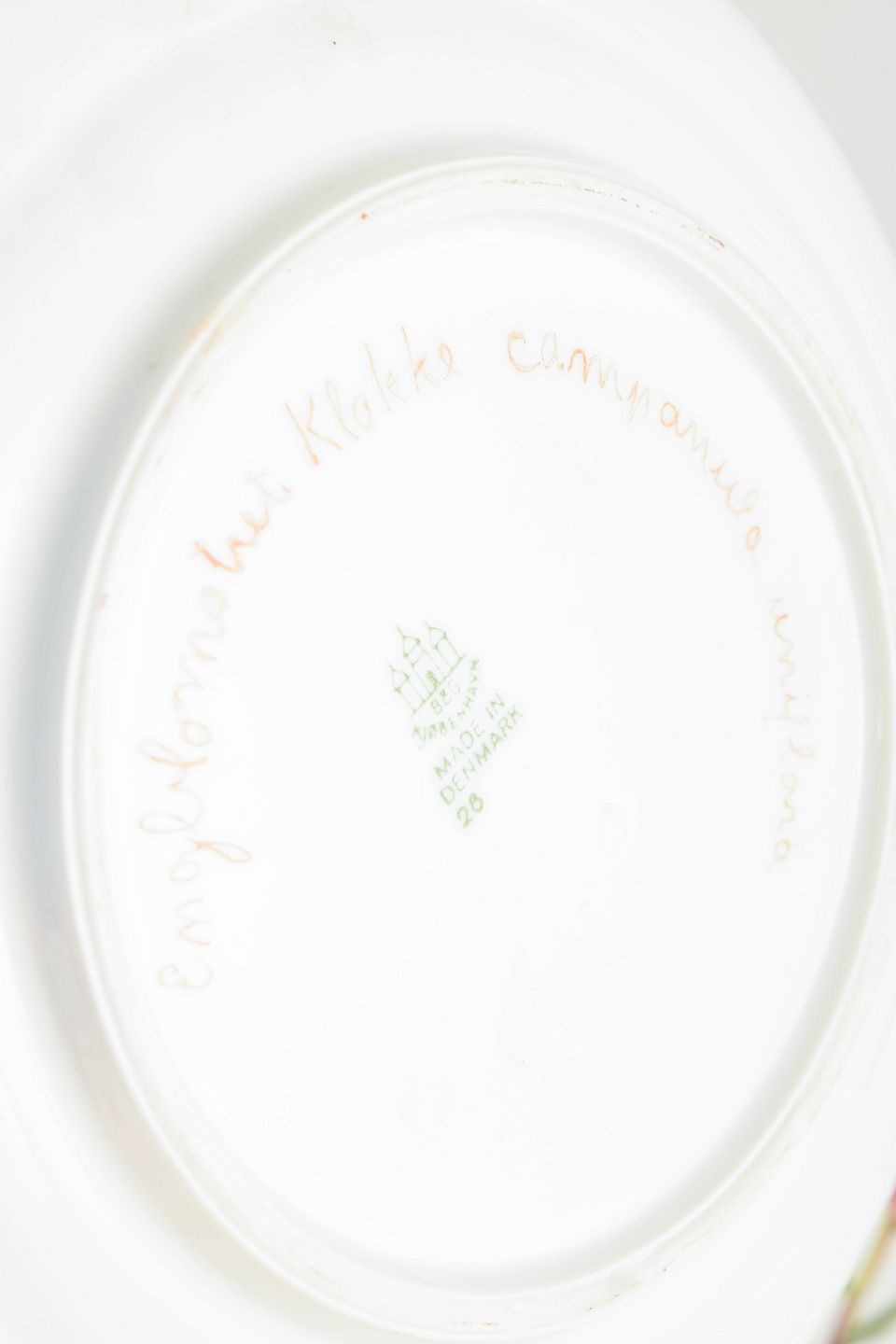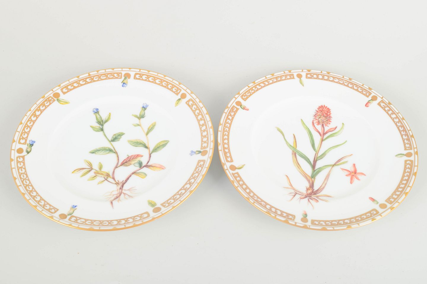 To porcelænstallerkener med håndmalede botaniske motiver og guldbemaling langs kanten. 2. sortering.