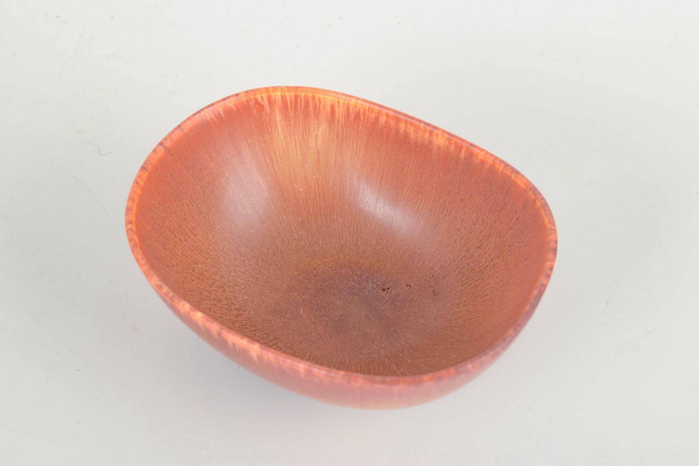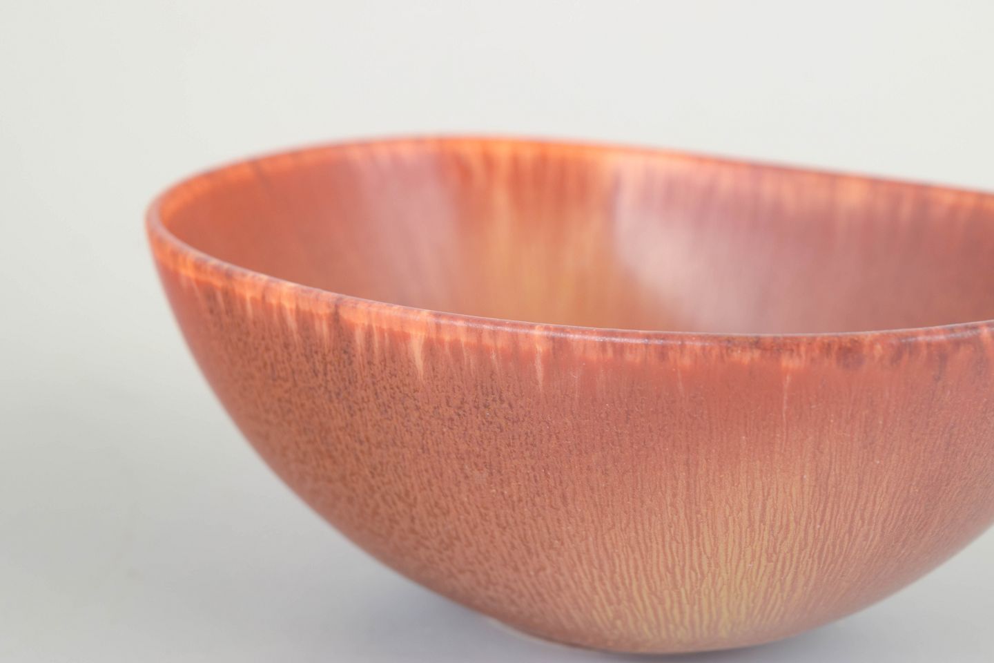 Organisk formet stentøjsskål med svagt asymmetrisk, blødt svungent profil og varm rosa glasur med lodrette løbende nuancer i orange og gyldne toner — et elegant eksempel på Stålhane’s eksperimentelle glasurarbejde.