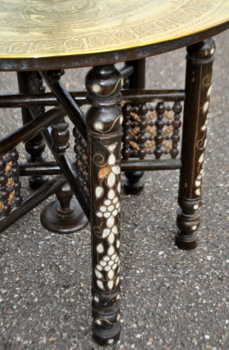 Arabisk rygebord med messingplade, 19./20. årh. Messsingplade dekoreret med mønstre. Understel i træ med indlagt perlemor. H.: 49 cm. Dia.: 59 cm.