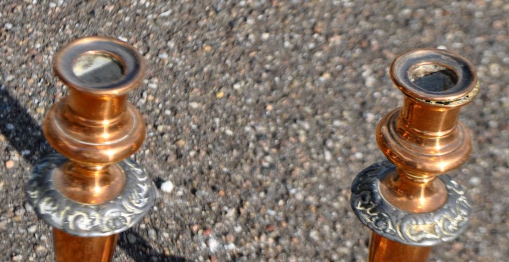 Et par engelske kobberstager med tin, 19. årh. H.: 30,5cm.