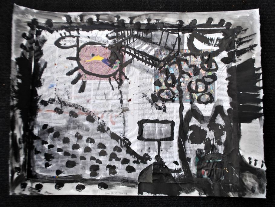 Kühl, Lena (1950 -) Danmark: Komposition, 2024. Collage med avisudklip og tusch. Signeret: Lena Kühl 2024. H: 56 cm. B: 76 cm.