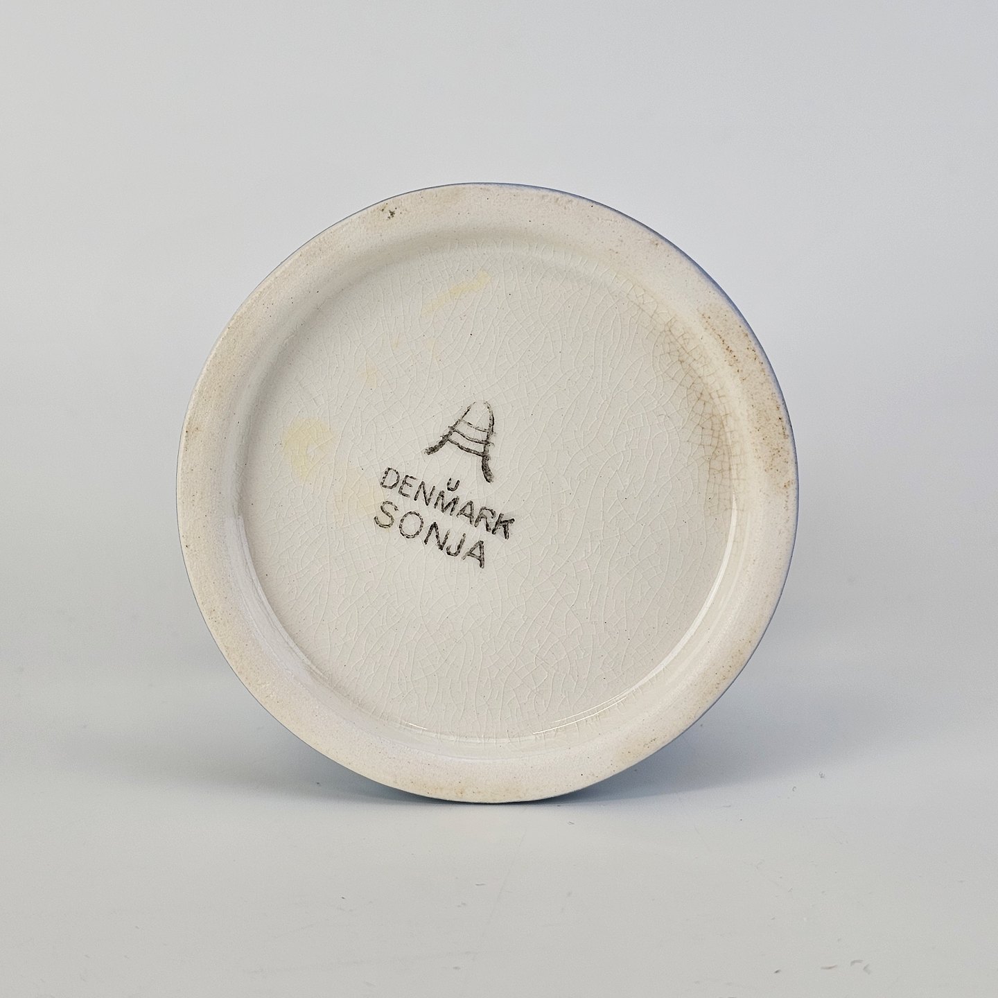 Fremstår med krakeleringer i glasuren og en misfarvning under bunden