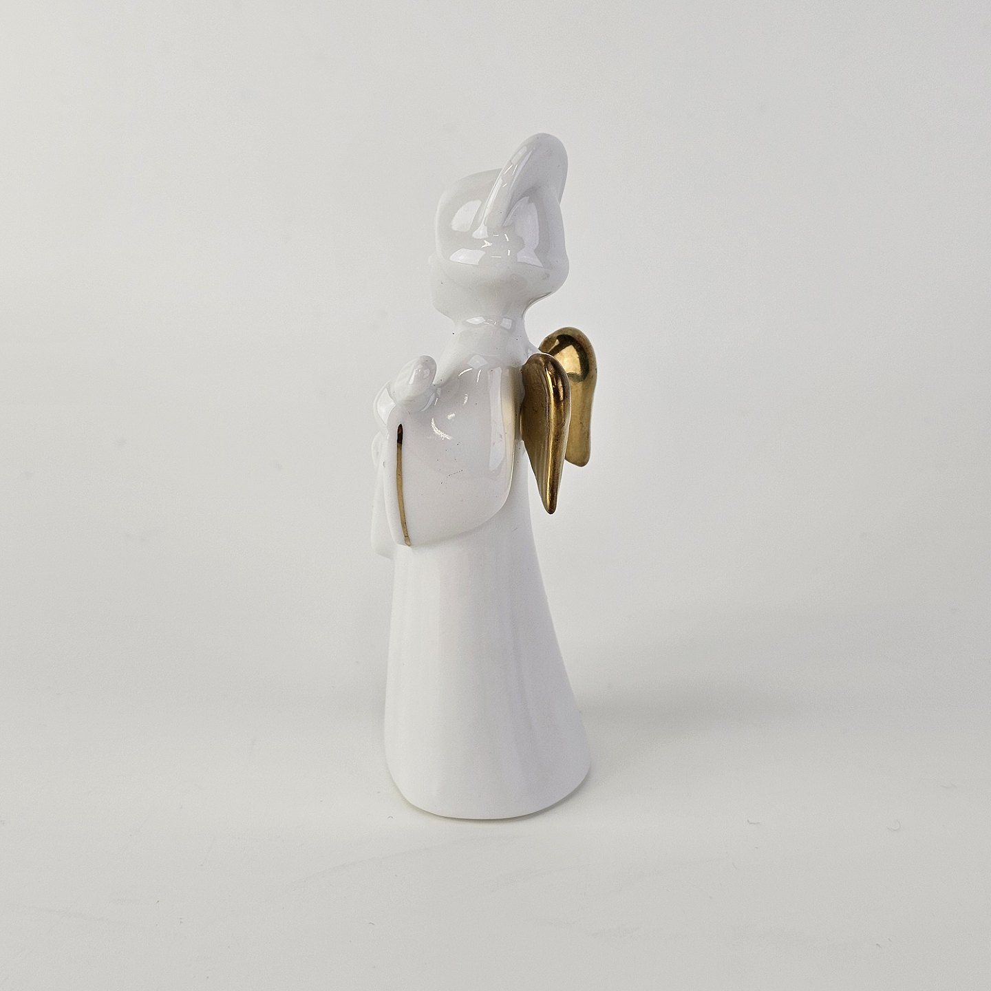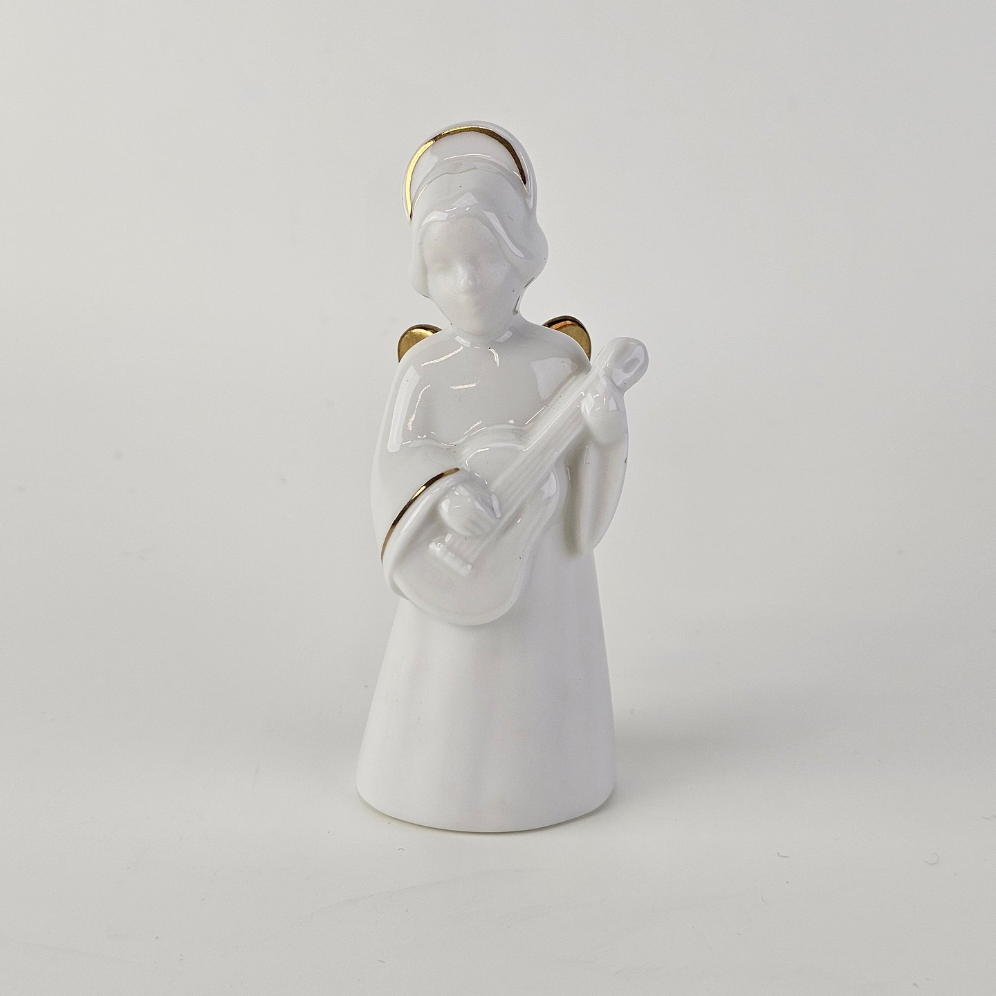 Figur med motiv af en engel som spiller på guitar. Figuren er i hvidt porcelæn med forgyldte vinger og detaljer i 24 karat guld.