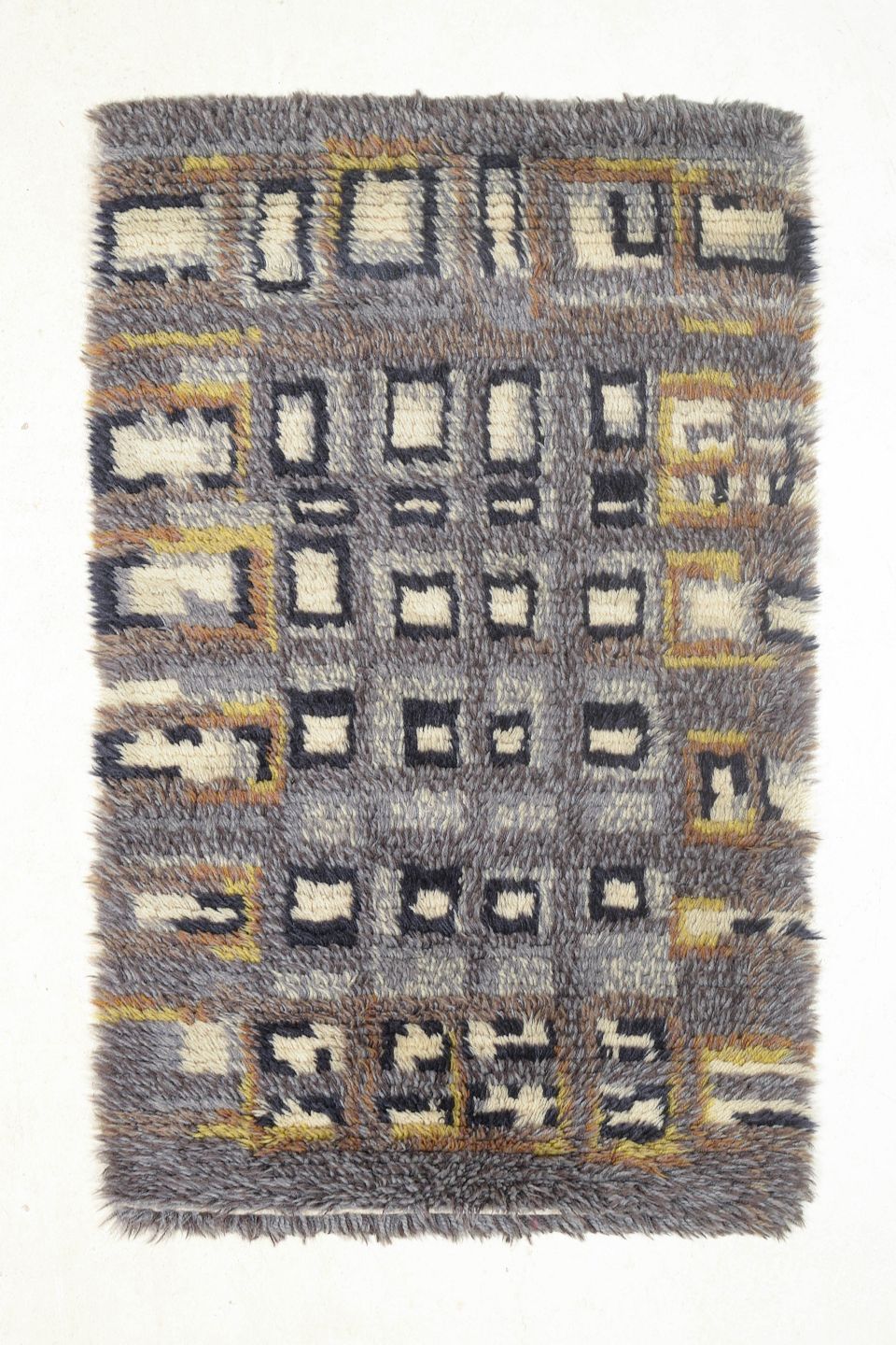 Håndknyttet rya-tæppe i uld med geometrisk mønster i grå, creme, gul og sorte nuancer. Et grafisk og harmonisk design, typisk for skandinavisk tekstilkunst i perioden, hvor modernistiske principper blev oversat til dekorative, håndlavede tekstiler.