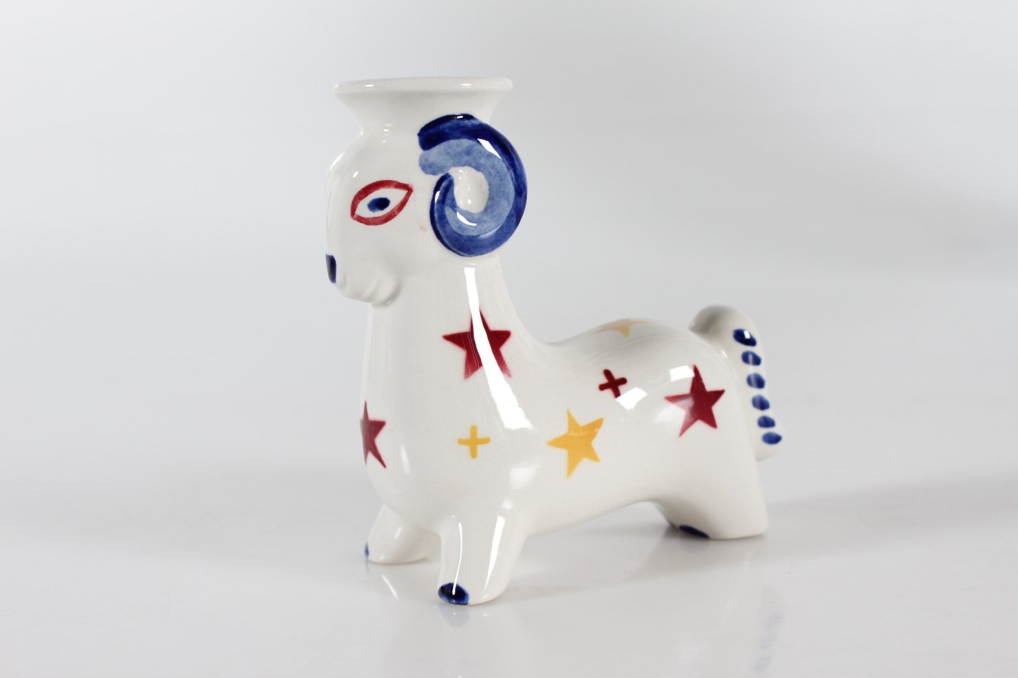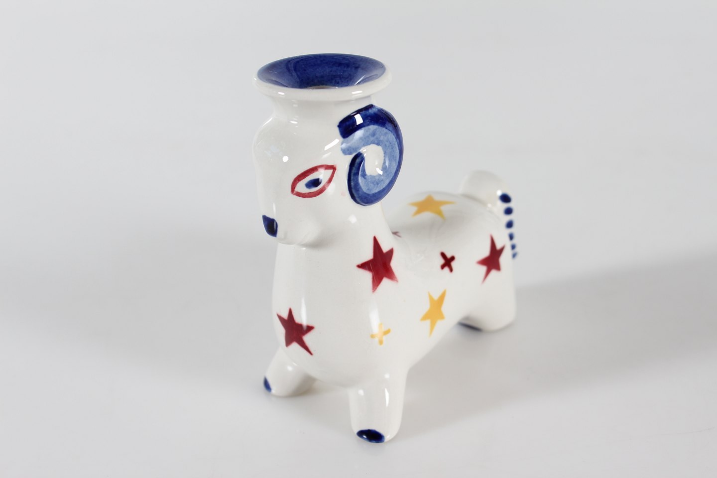 Julebuk i fajance udformet som lysestage med blå ring