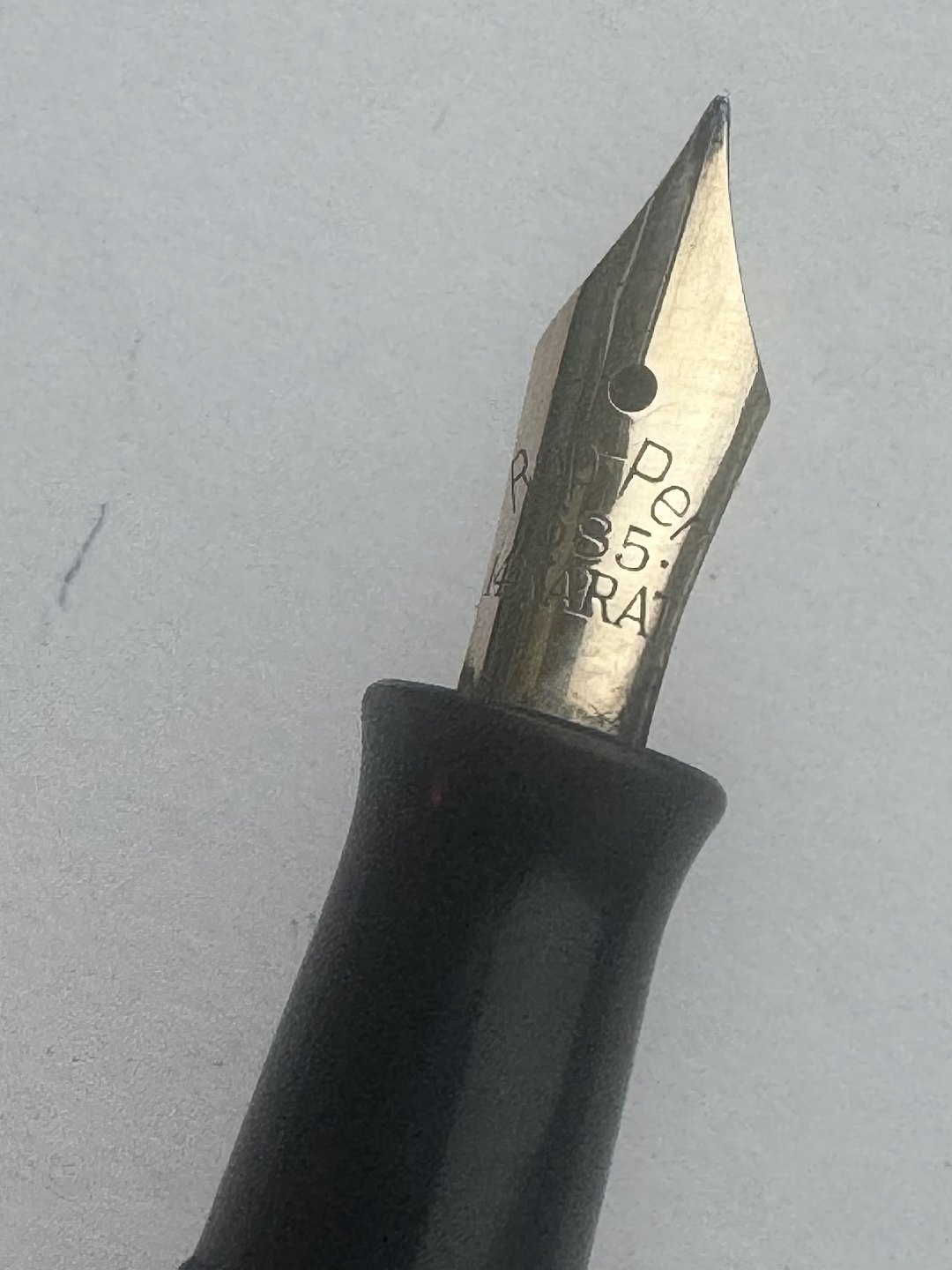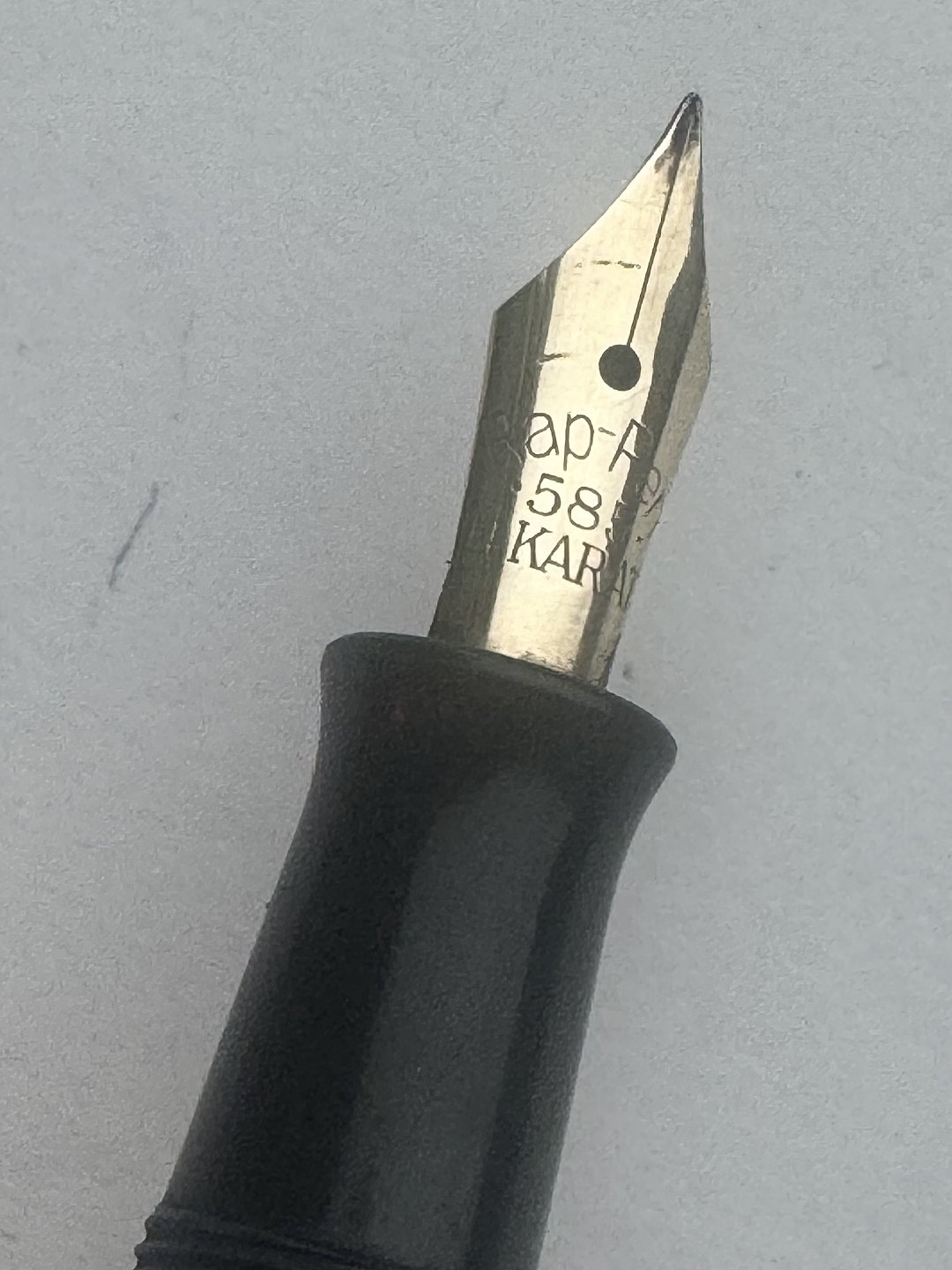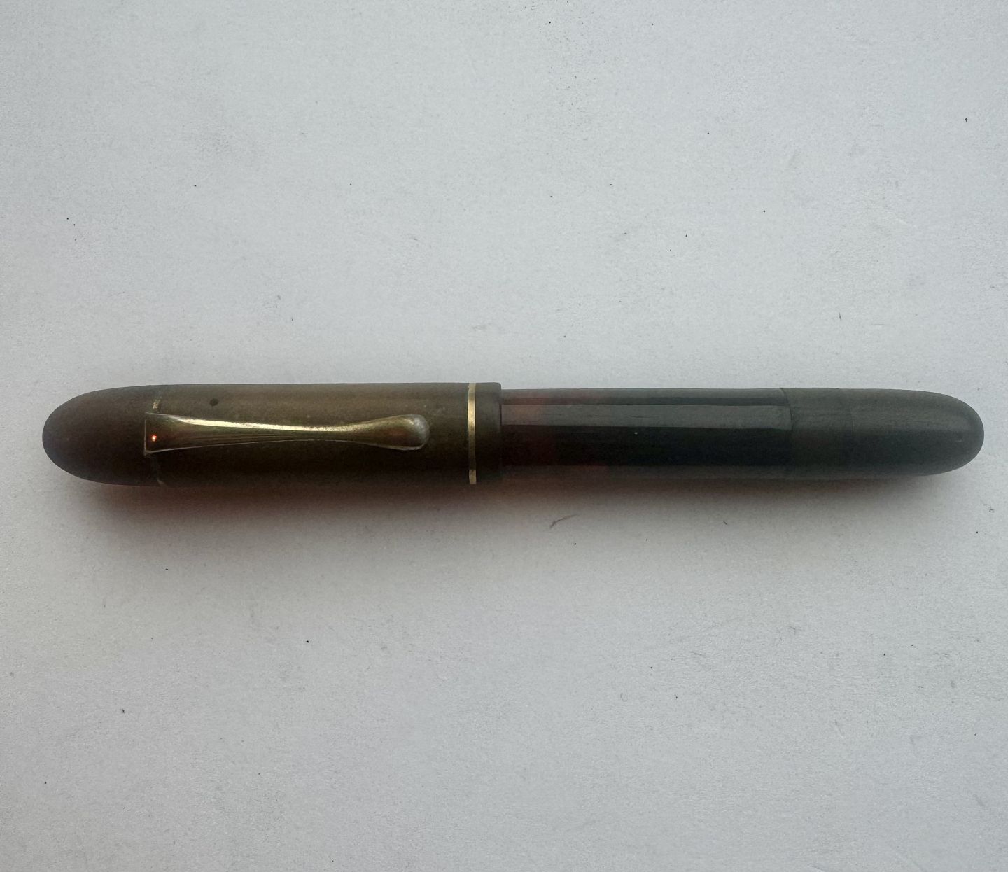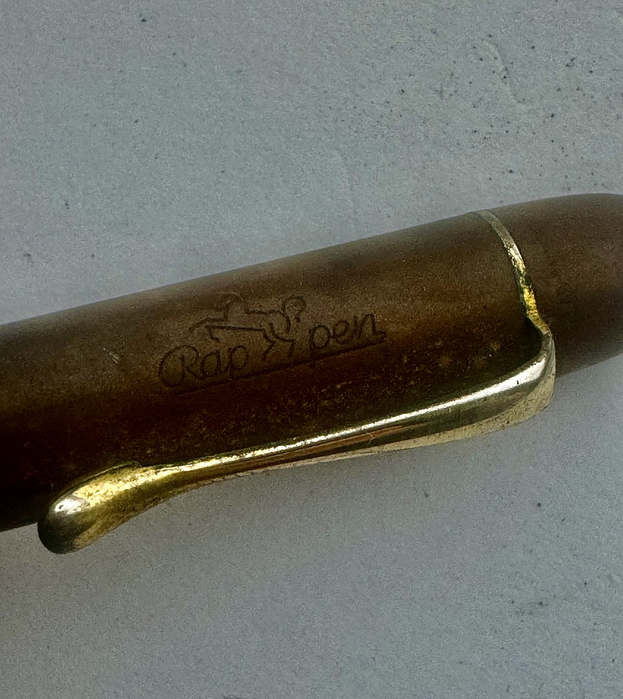 Sort Rappen fyldepen fra begyndelsen af 1930'erne. Piston blæk-påfylder med transparent blækvindue. Stemplet kører frem og tilbage, når bundskruen aktiveres, men den kan ikke optage blæk, hvorfor den skal restaureres inden den igen fungerer som fyldepen. Hætten er misfarvet, hvorfor den ikke helt har samme farve som resten af pennen. Fremstillet hos Pelikan i Tyskland, hvilket pennens design i virkeligheden afslørerL 11,2 cm