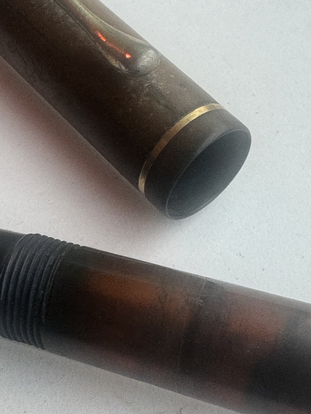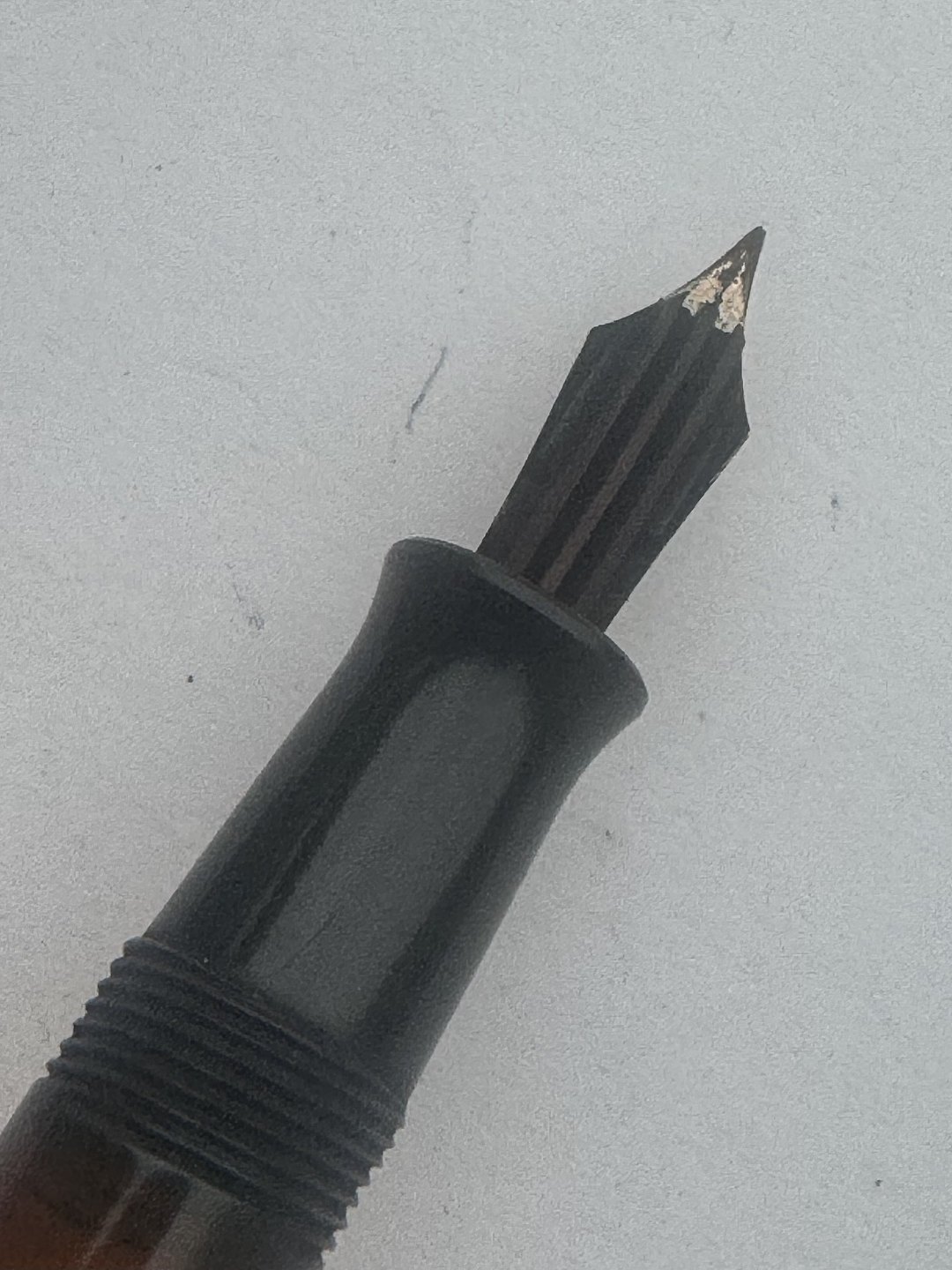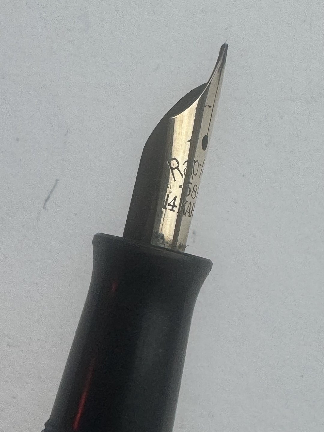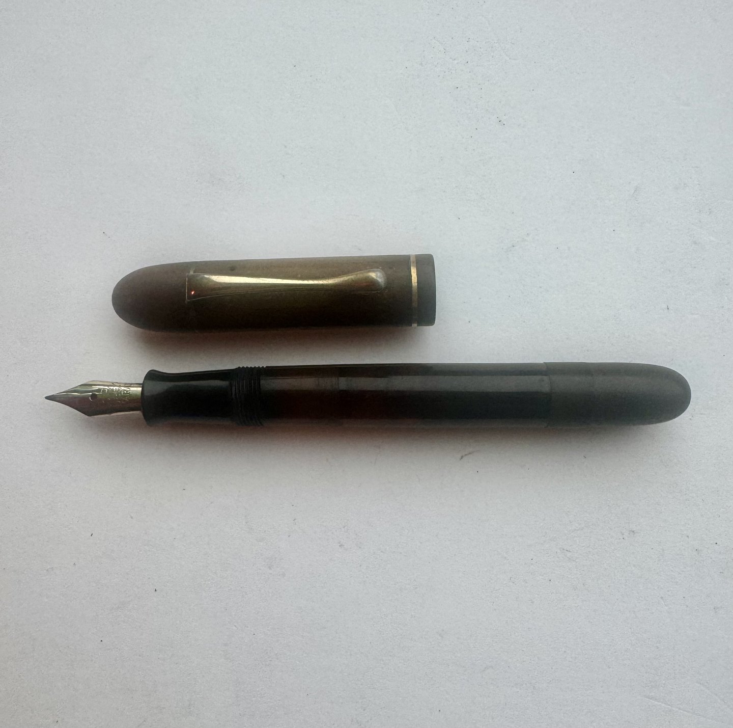 Sort Rappen fyldepen fra begyndelsen af 1930'erne. Piston blæk-påfylder med transparent blækvindue. Stemplet kører frem og tilbage, når bundskruen aktiveres, men den kan ikke optage blæk, hvorfor den skal restaureres inden den igen fungerer som fyldepen. Hætten er misfarvet, hvorfor den ikke helt har samme farve som resten af pennen. Fremstillet hos Pelikan i Tyskland, hvilket pennens design i virkeligheden afslørerL 11,2 cm