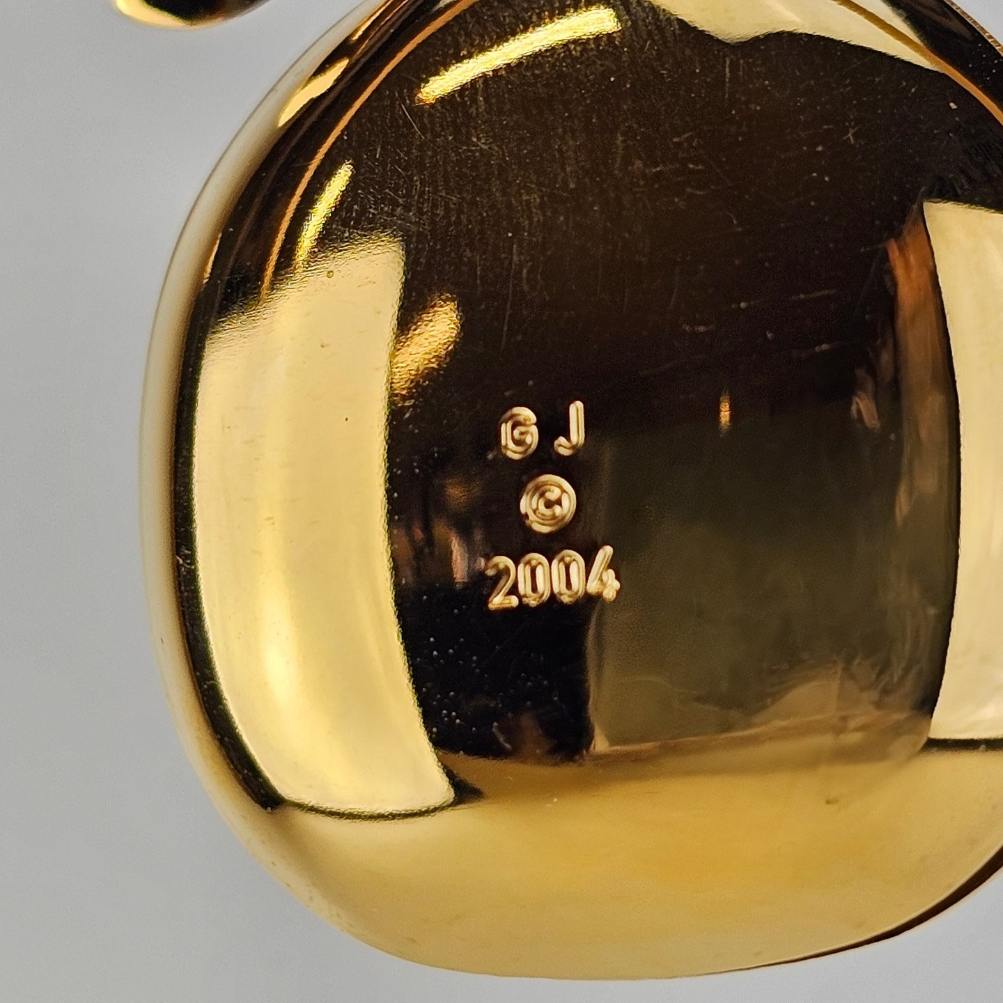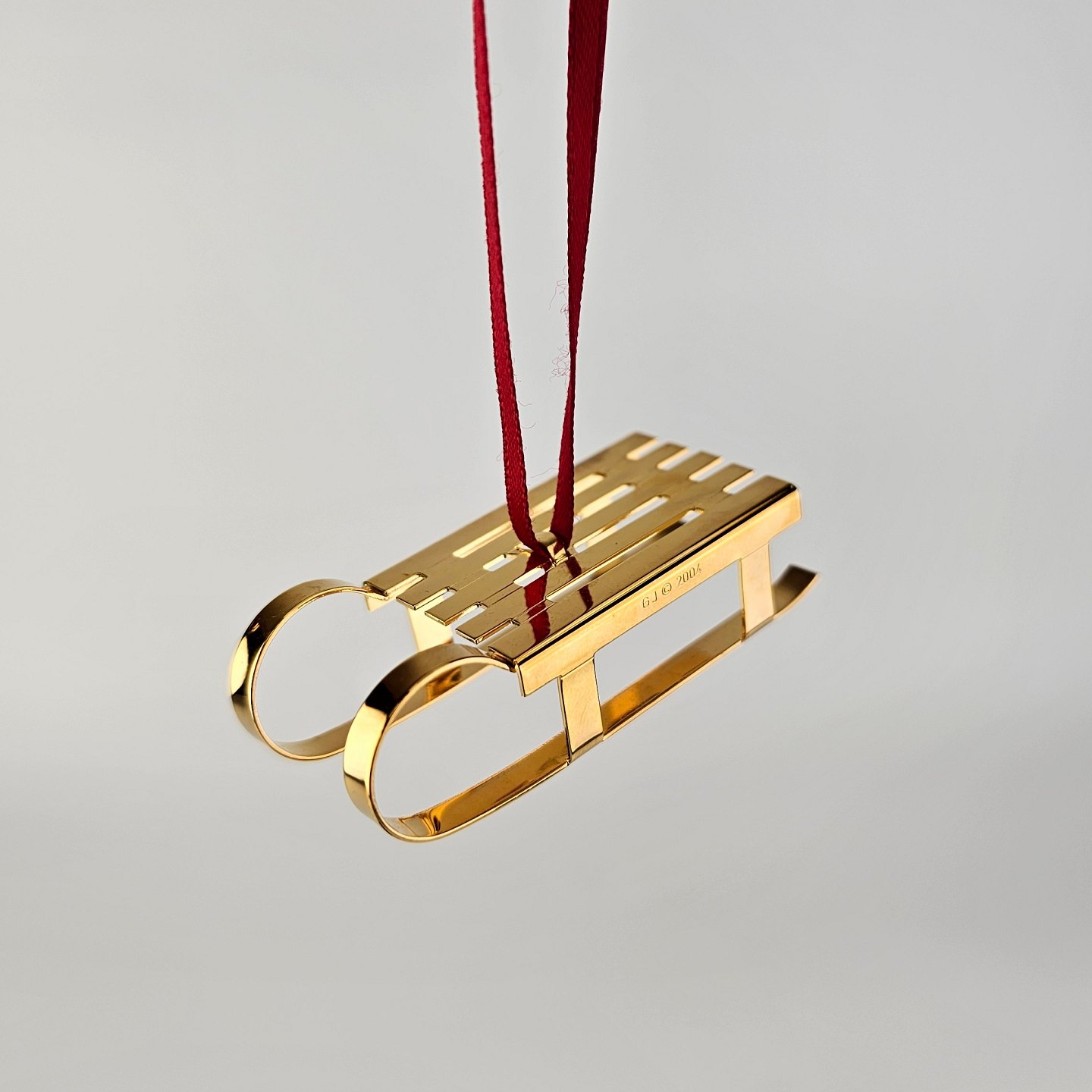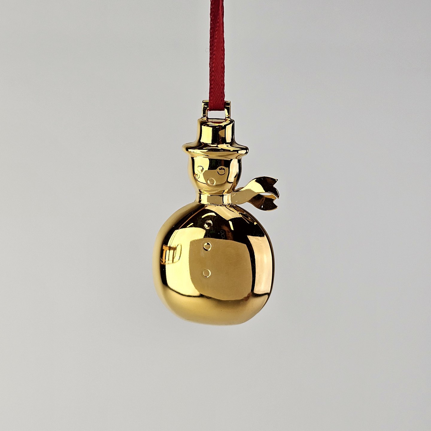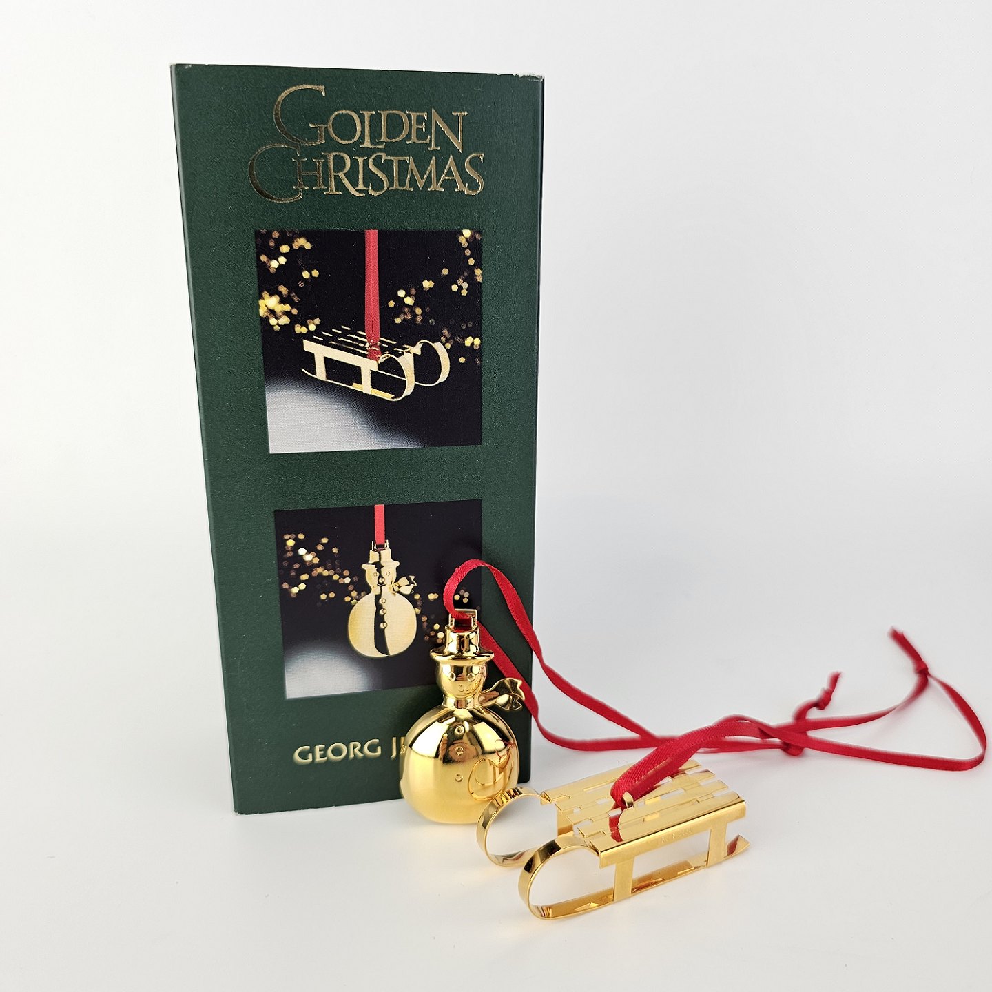 To juleornamenter til ophæng med form af en snemand og en kælk i messing forgyldt med 24 karat guld