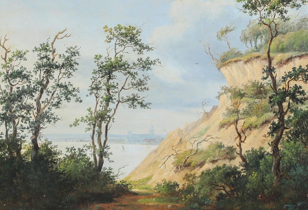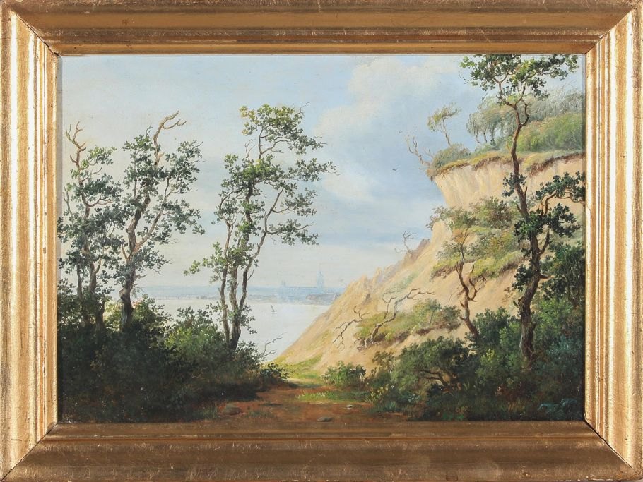 Holm, Peter (1798 - 1875) Danmark. Sommerlandskab med over Aarhus Bugt og byen, set fra skrænterne i Risskov. Olie på metalplade. Signeret P. Holm (n.t.v.) 18 x 25 cm.