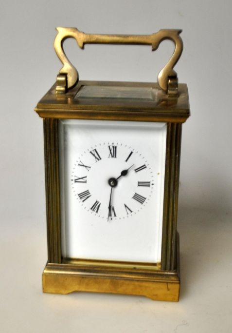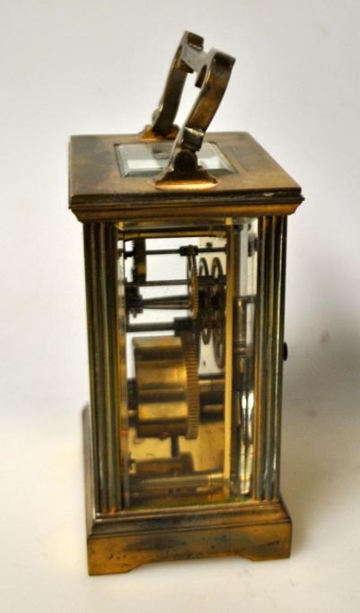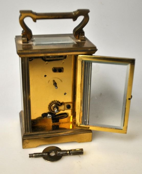 Fransk rejseur i messing, 19. årh. Med glas. Emalje urskive med romertal, sorte visere. Glas facetslebet, og man kan se ind i uret fra fire vinkler. H.: 11,5 cm. Med håndtag: 16 cm. Medfølgende nøgle.
