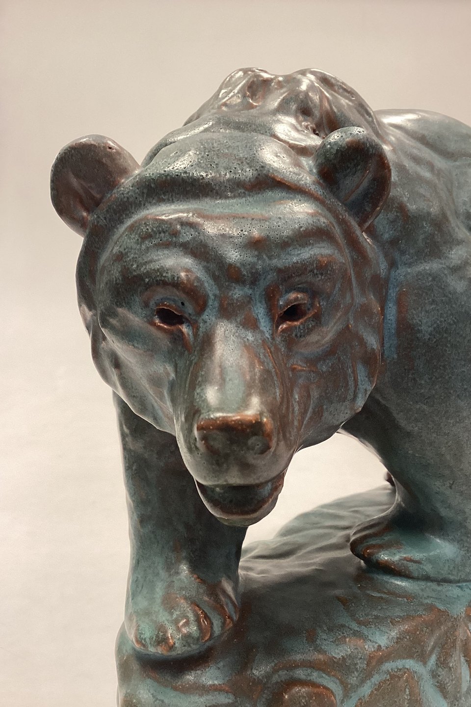 Arne Ingdam Stentøjsfigur af Bjørn. Turkisgrøn glasur på rødbrunt stentøj. Signeret og mærket med et 9-tal. I meget fin stand.