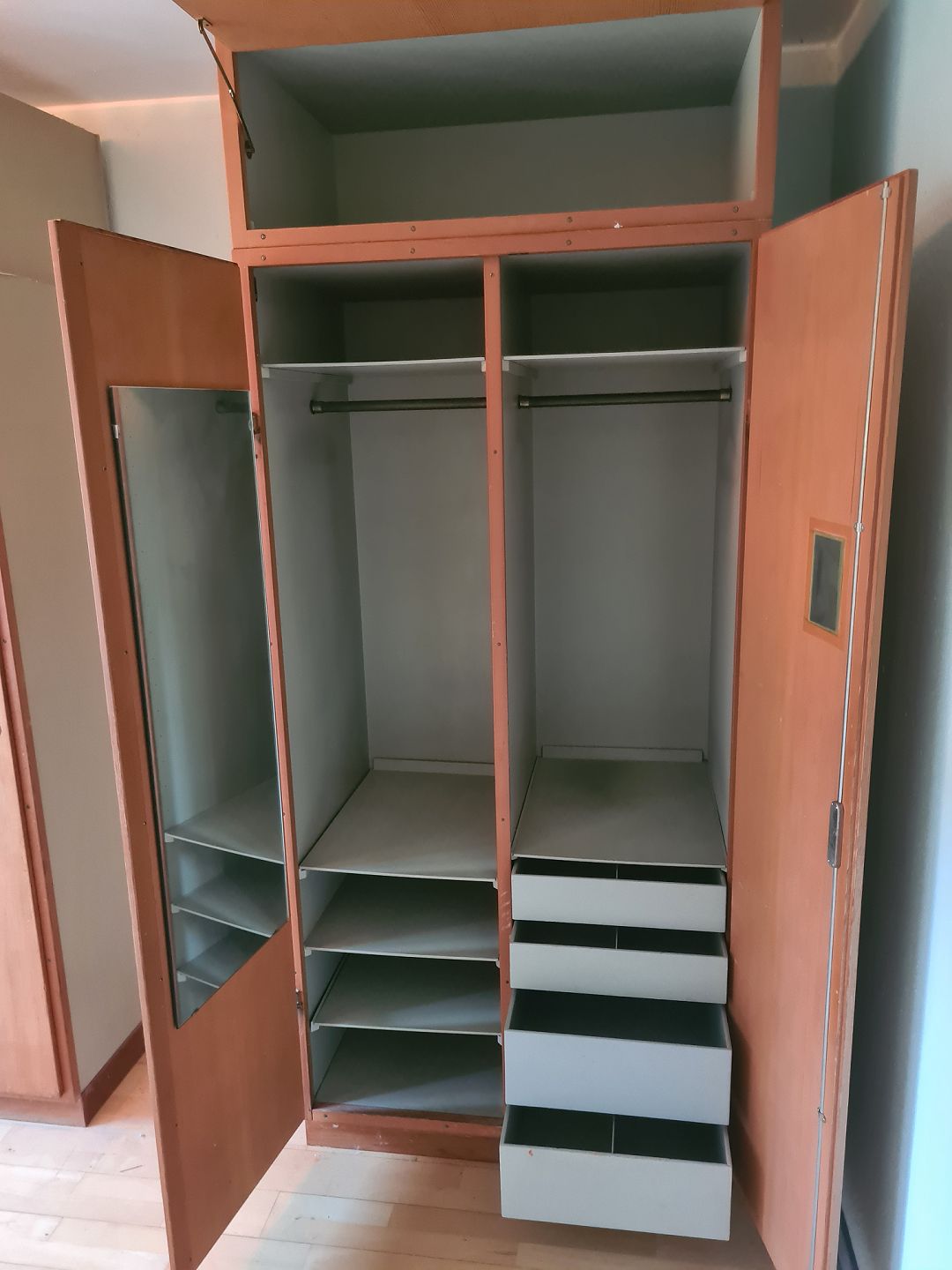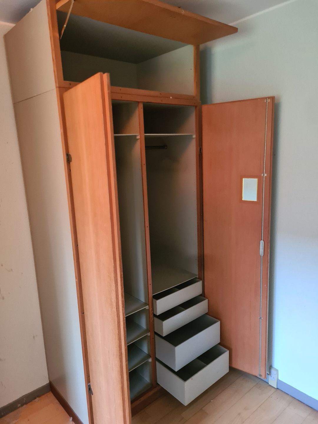 Boligens byggeskab fra 1960'erne med låger i Oregon pine designet af Børge Mogensen og Grethe Meyer. Fremstår i pæn brugt stand med uoriginalt spejl på indersiden af lågen og låsen virker, men griber ligesom ikke ordentligt fat. (Kan måske udbedres med lidt snilde) Kan evt. stå sammen med nr. 60675