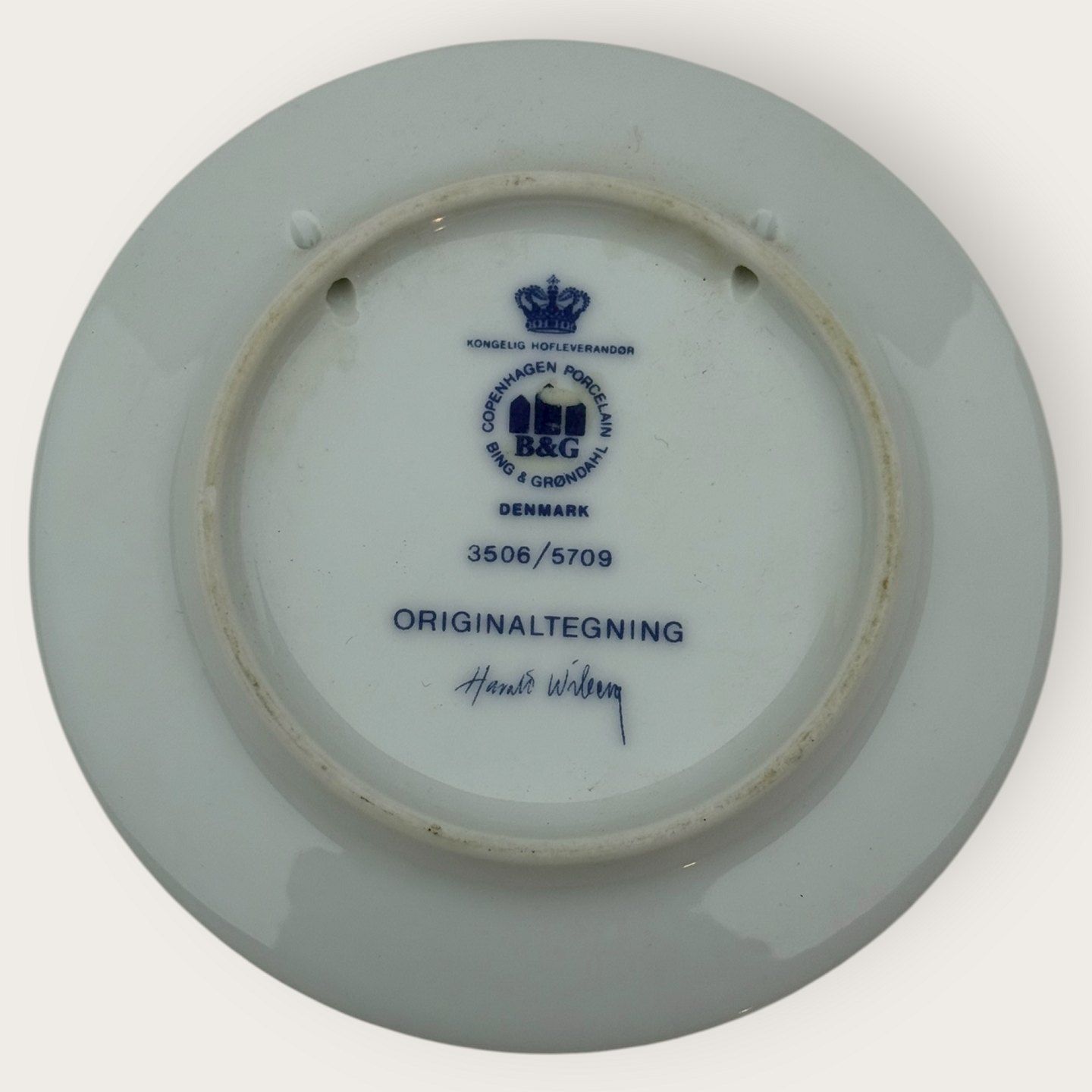 Bing & grøndahl, Julestel, Nissen og katten ved døren, Asiet med guldkant #3506 / 5709, 10,5cm i diameter, 2.sortering, Design Harald Wiberg *Pæn stand*