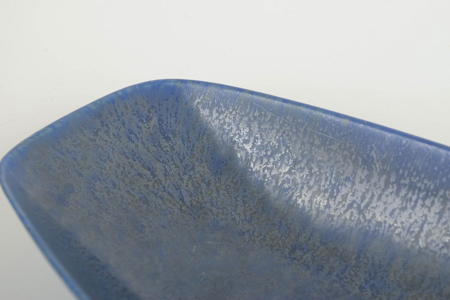 Elegant, lav skål i stentøj med bådformet profil og mat blå glasur med nuancer i kornet struktur.