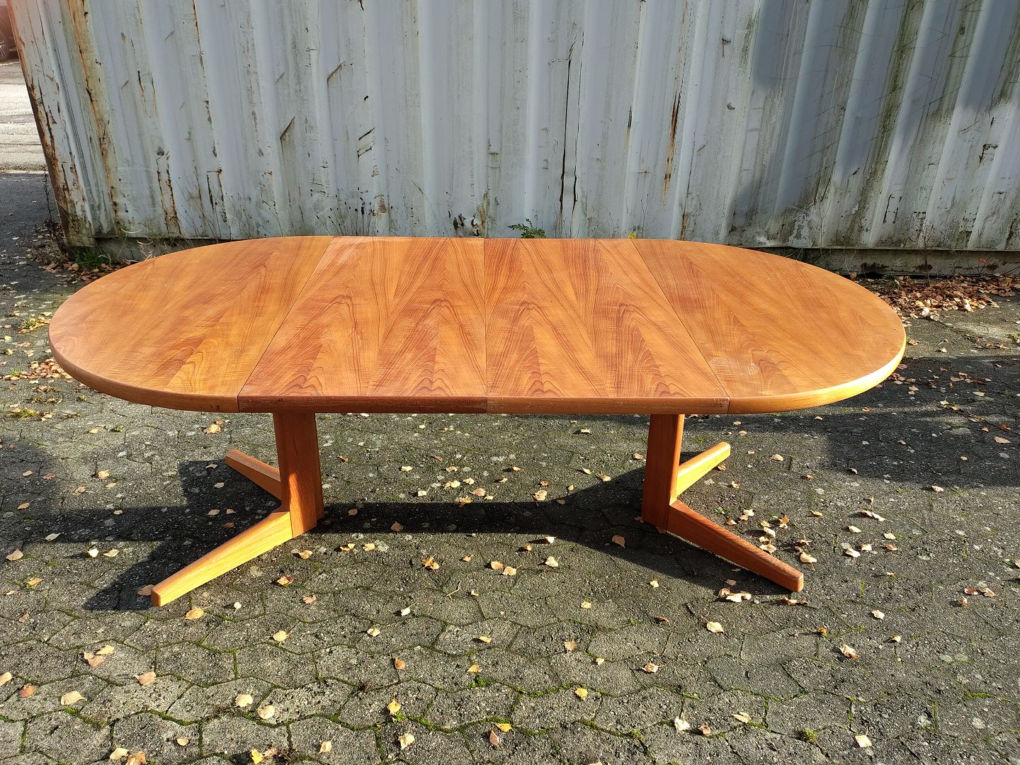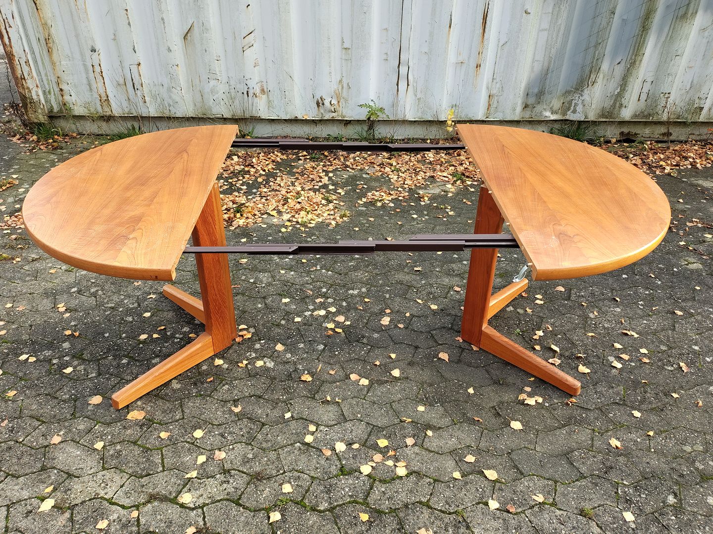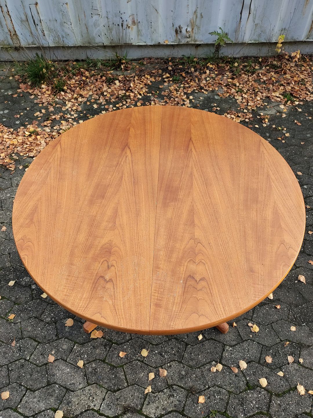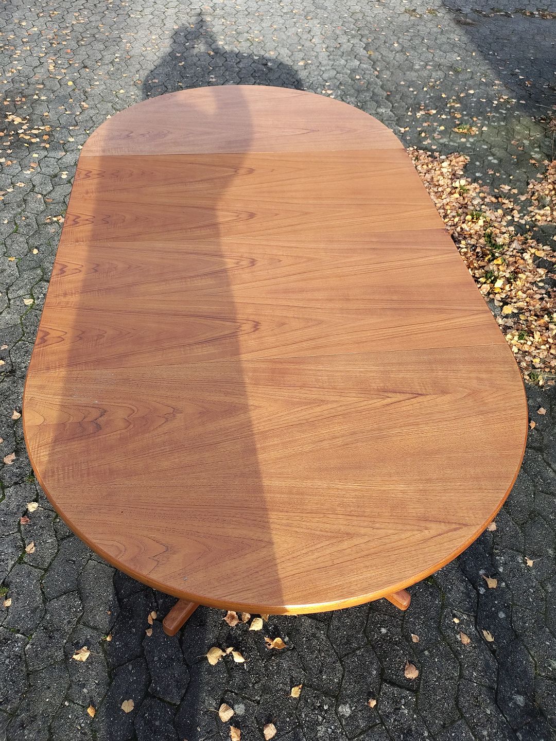 Spisebord i fineret teaktræ med 2 tillægsplader, fra 1960erne.