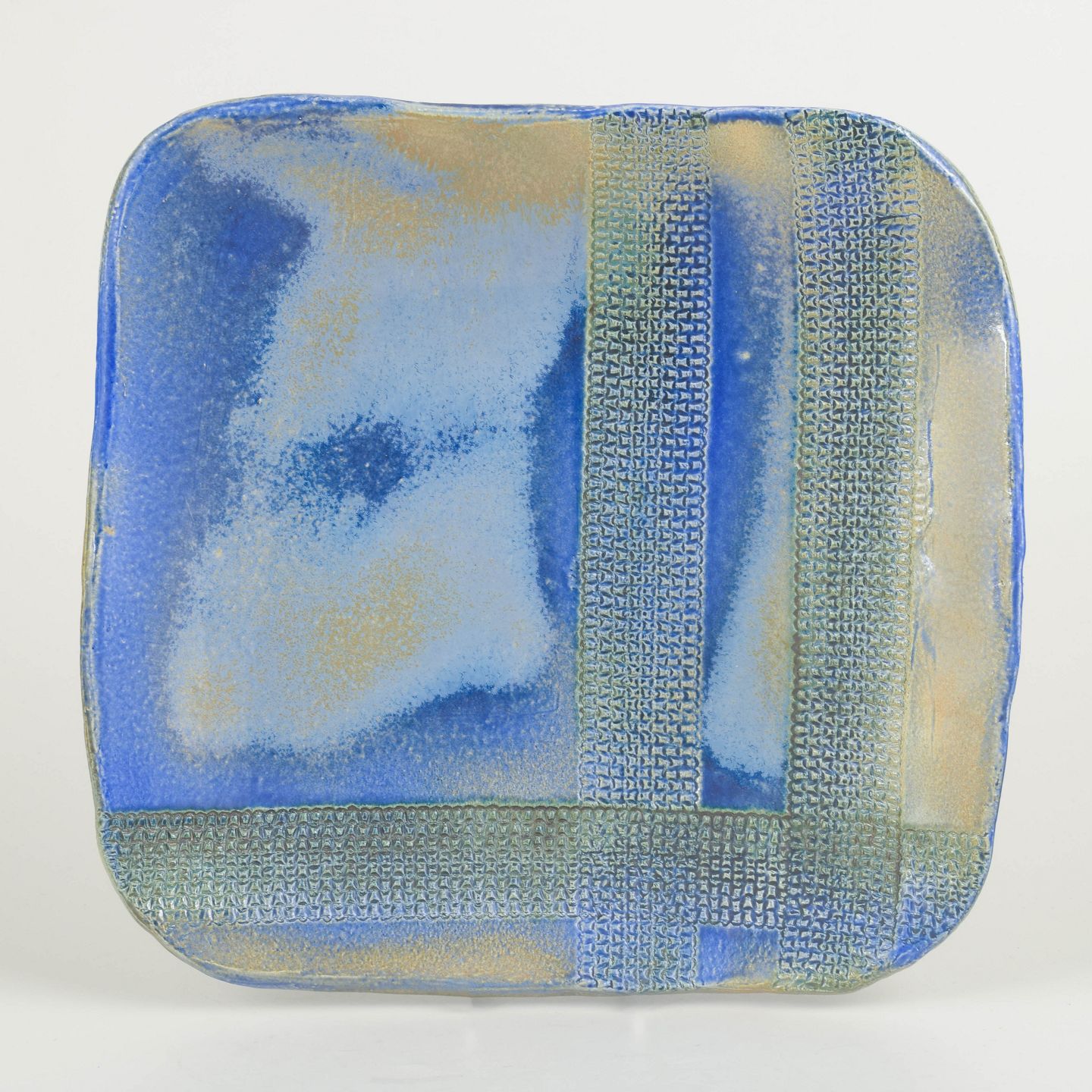 Håndlavet kvadratisk vægrelief i stentøj med eksperimenterende glasur i blå, grønne og gyldne toner. Dekoreret med reliefmønstre og glaserede felter i geometrisk komposition.