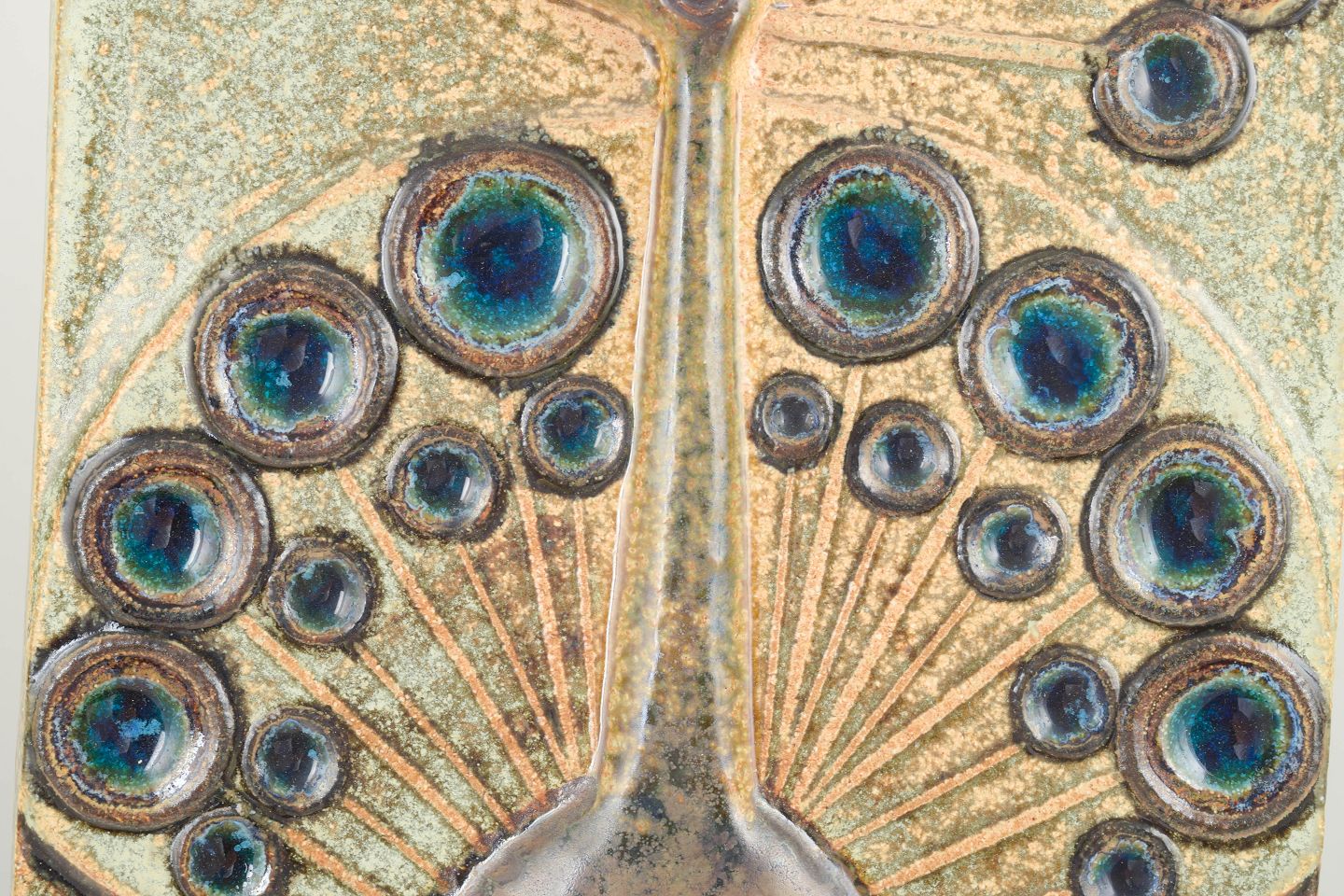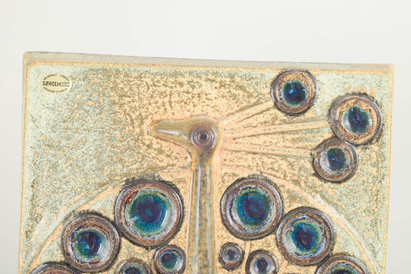 Keramisk vægrelief i reliefteknik med motiv af en stiliseret påfugl i grønne og blå glasurtoner.