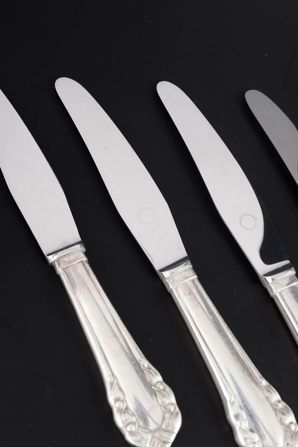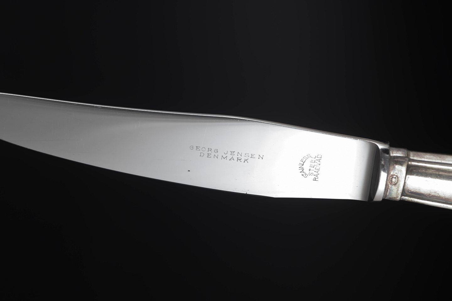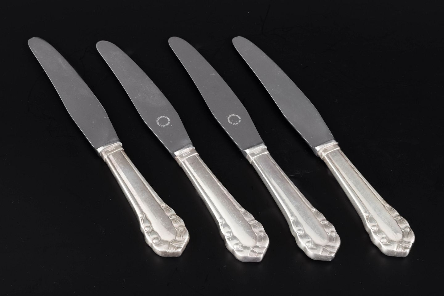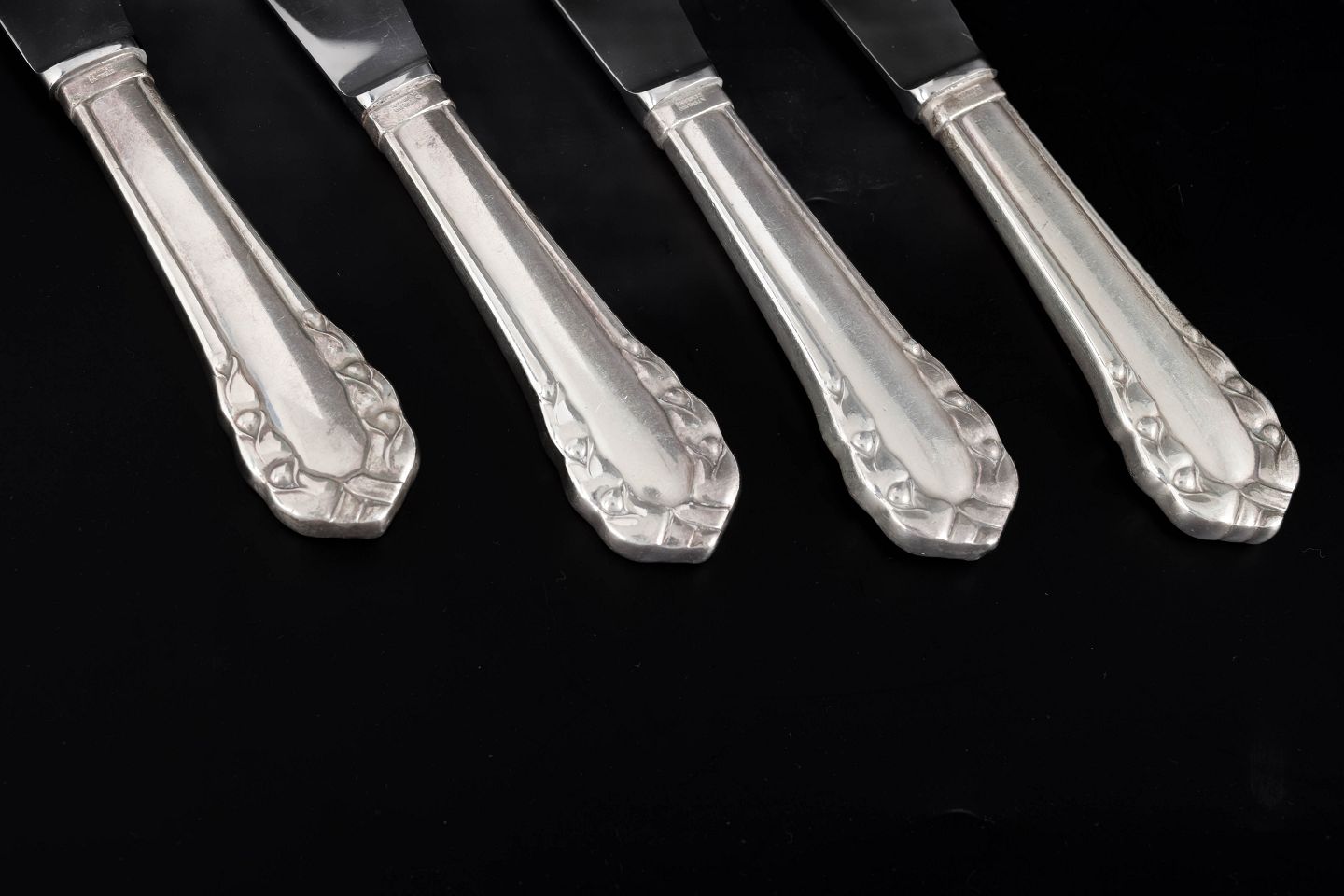 Sæt med fire frokostknive i det klassiske “Liljekonval”-mønster. Knivene har klinger i rustfrit stål og skæfter i sterlingsølv, udført i elegant art deco-stil med blomsterornamentik. Klingerne stemplet “GEORG JENSEN DENMARK / STAINLESS STEEL RAZOR EDGE”.