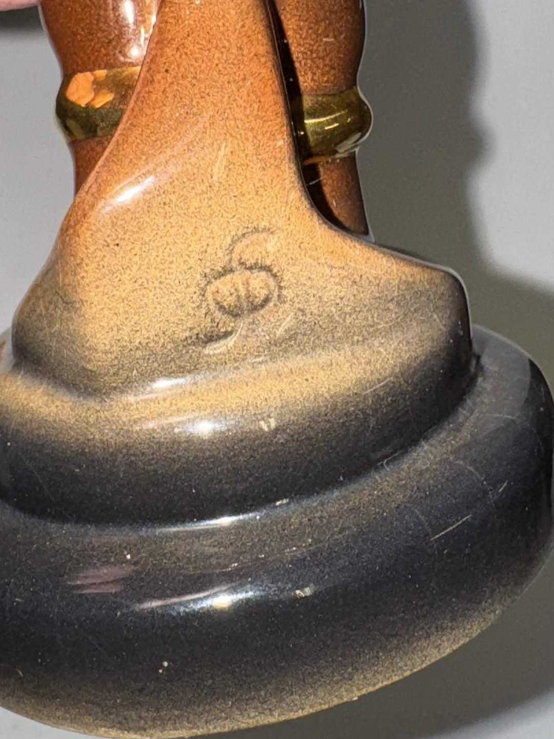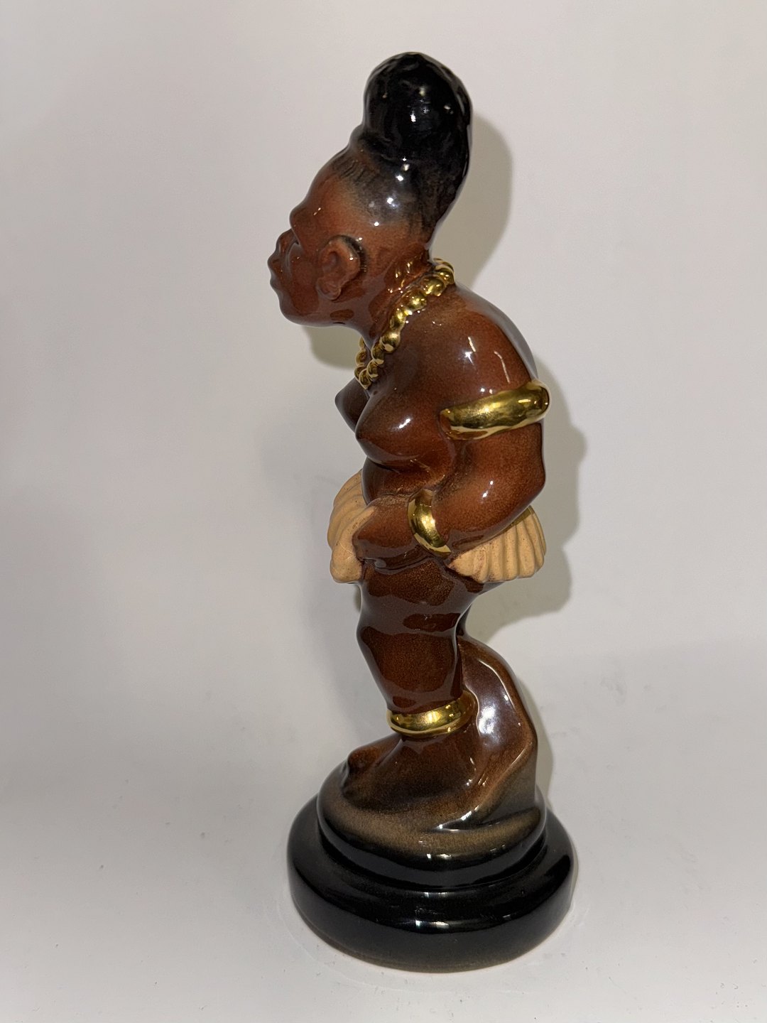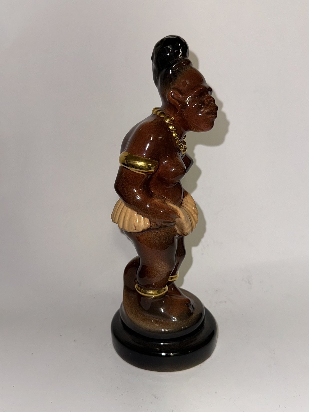 Figur i keramik af afrikansk kvinde i skørt. Fremstillet på det bornholmske keramik værksted Johgus. Fremstår i god stand. Signeret af kunstneren på bagsiden. Fabriksmærket på bunden. H. 21,5 cm