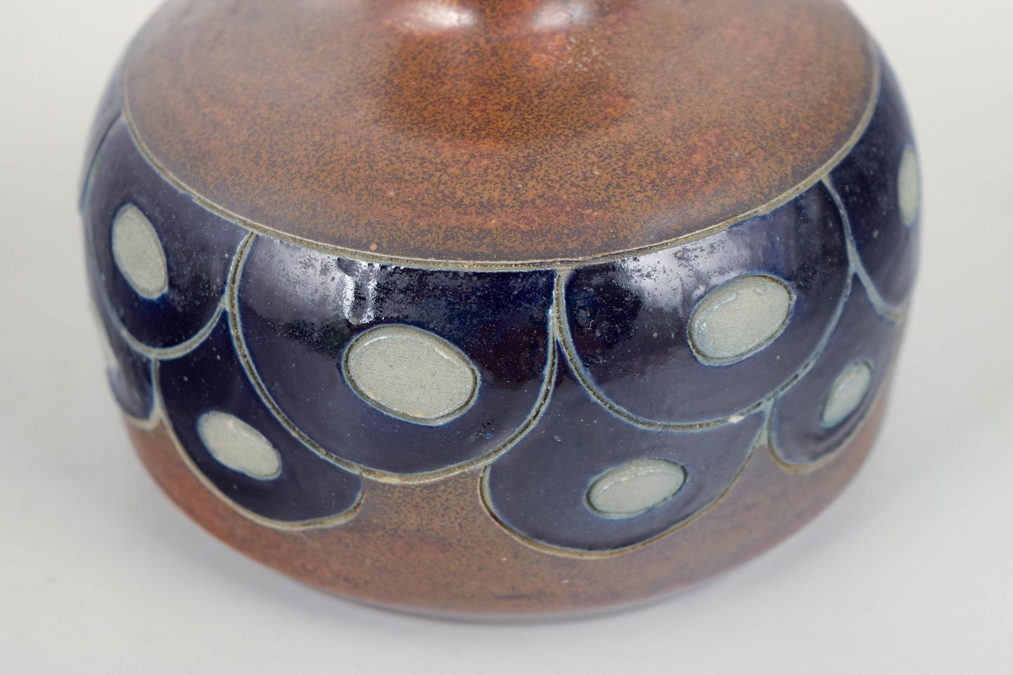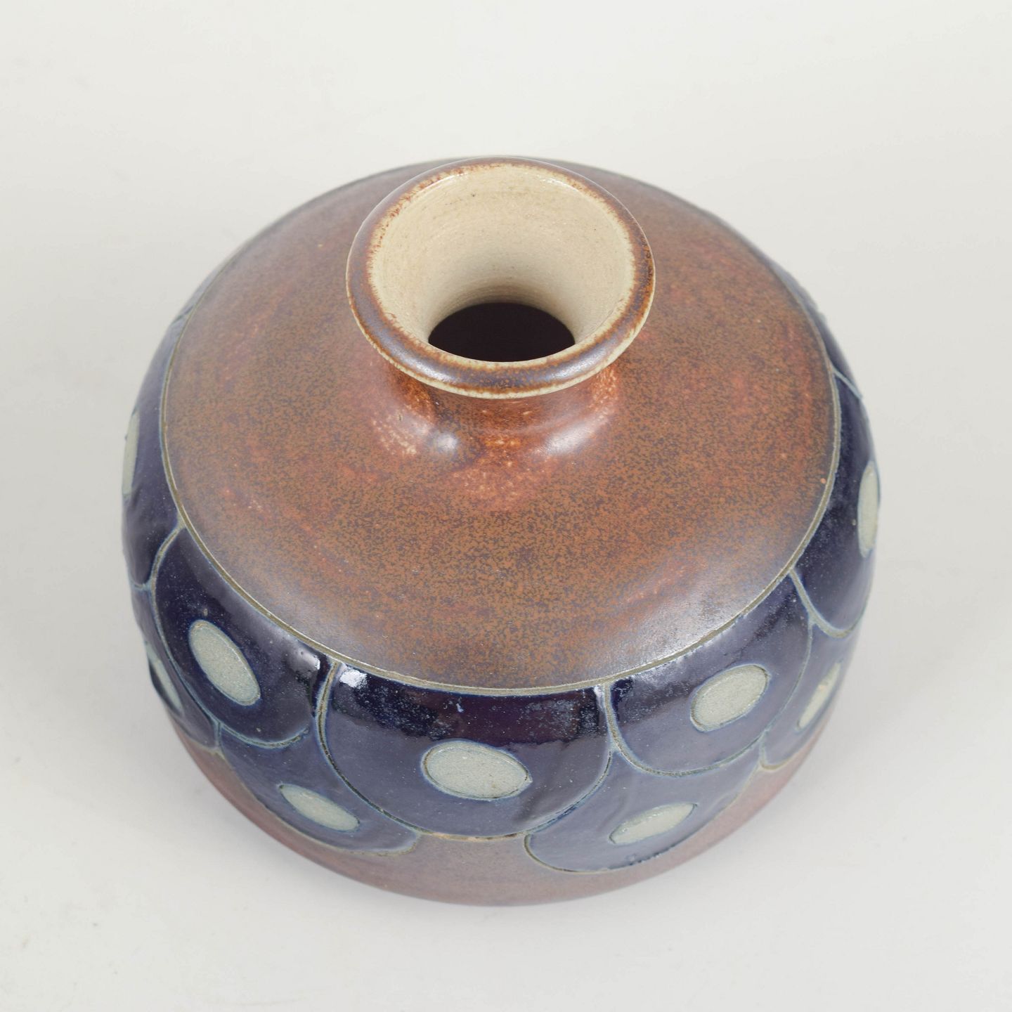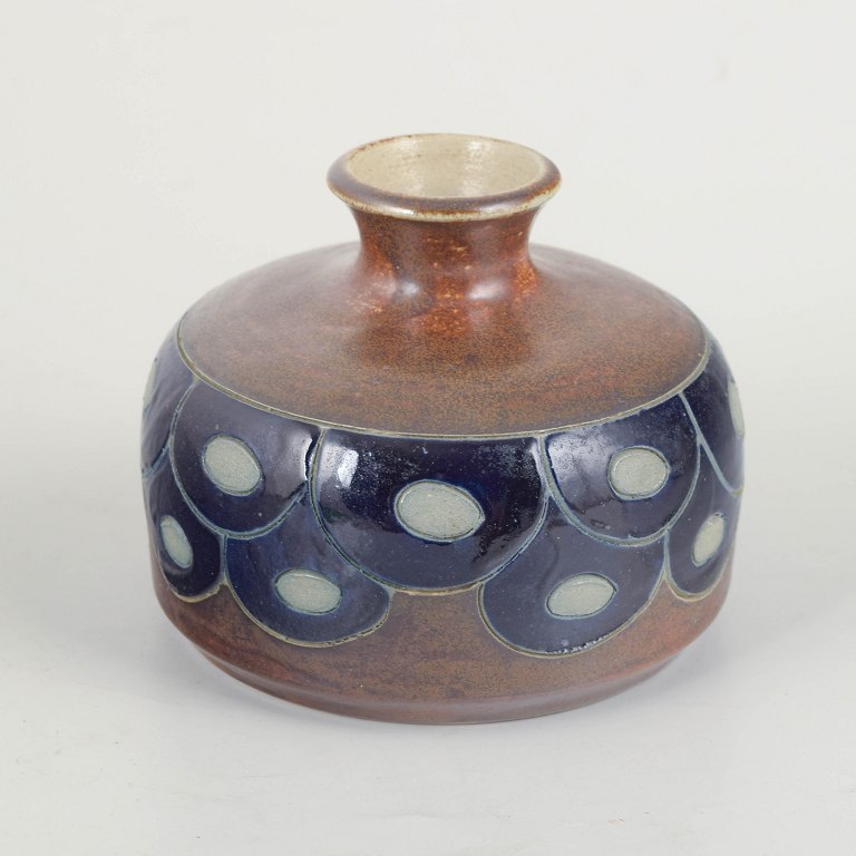 Unika håndlavet stentøjsvase i afrundet form med kort hals og dekorativ bånddekoration i dybblå og lyse felter.