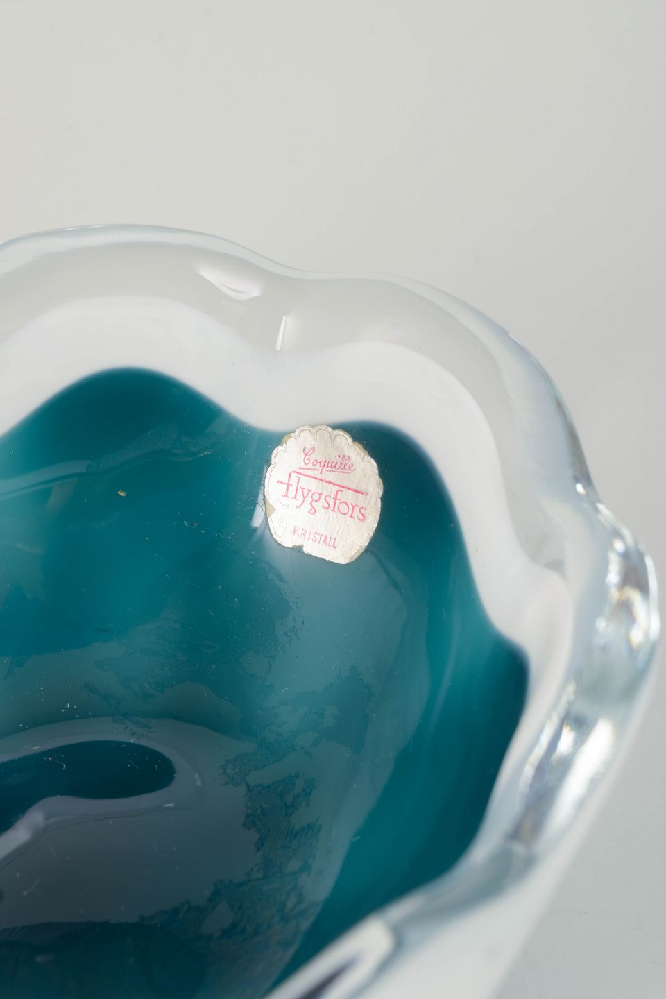 Organisk formet “Coquille”-skål i flerlaget kunstglas med turkis og hvid indre farvelægning samt klar yderste glaslag.