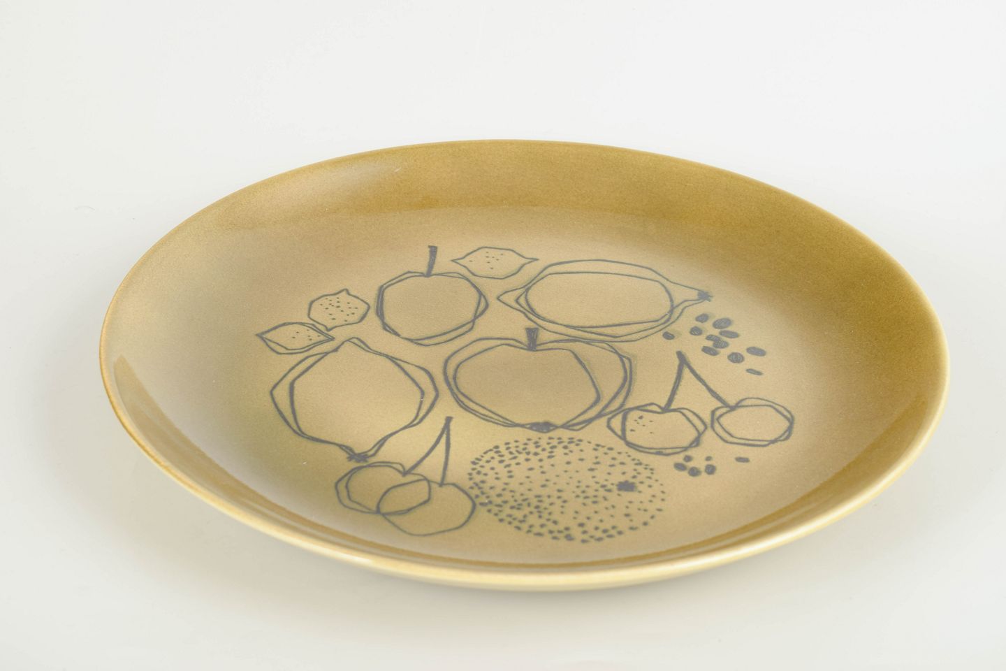 Keramisk fad med grafisk frugtmotiv i sort på sennepsgul glasur – et karakteristisk eksempel på Olin-Grönqvists enkle, legende streg og Arabia-fabrikkens dekorative design fra perioden.