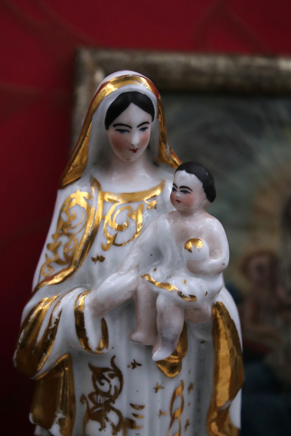 Decorative, old Madonna figurine in porcelain of the Virgin Mary with the baby Jesus...