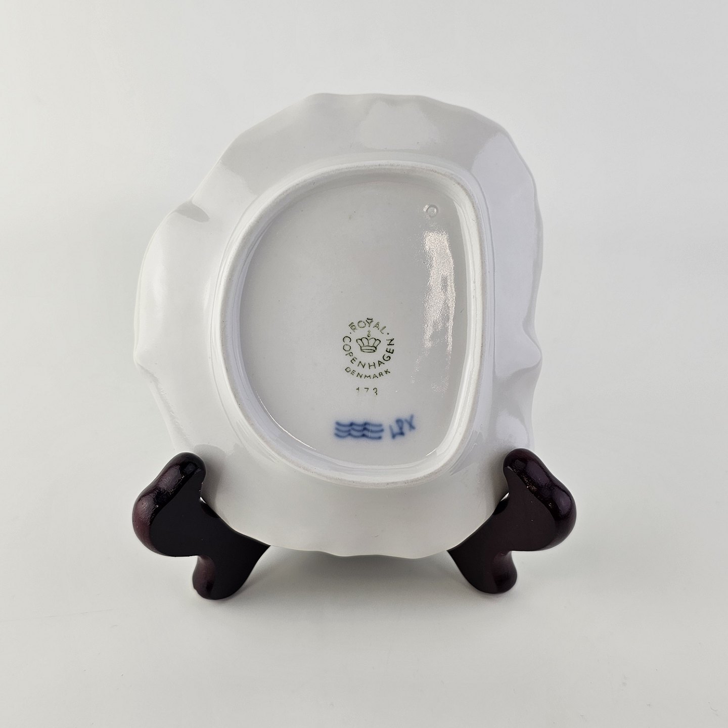 Skål i hvidt kongeligt porcelæn med motiv af en frø på en åkande og musselmalet dekoration