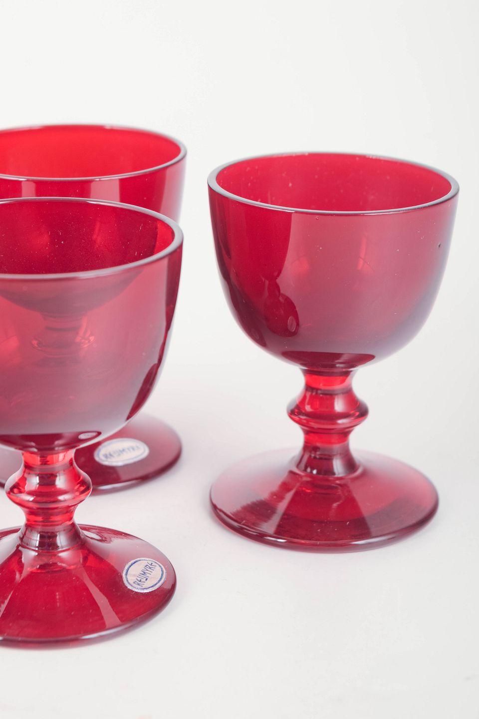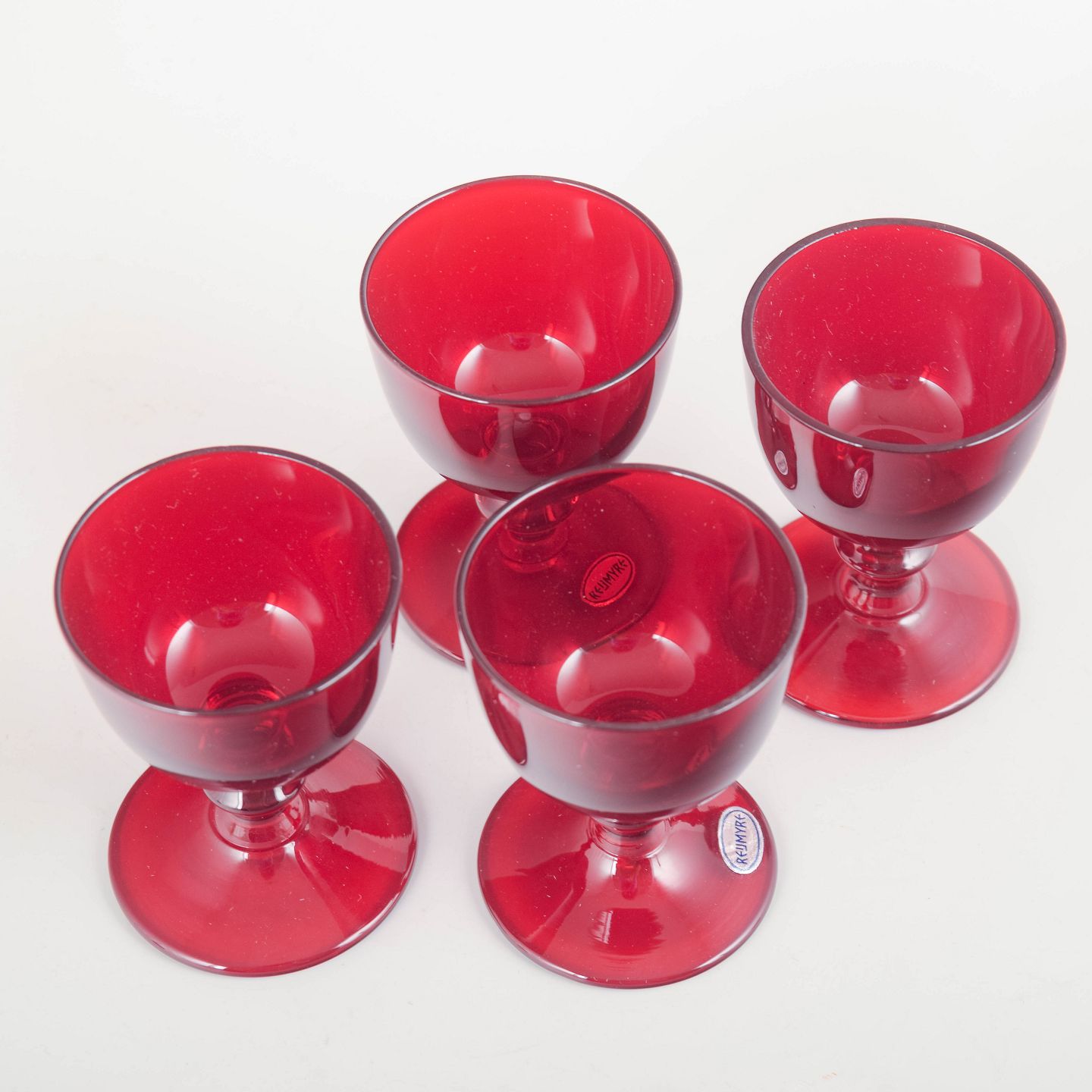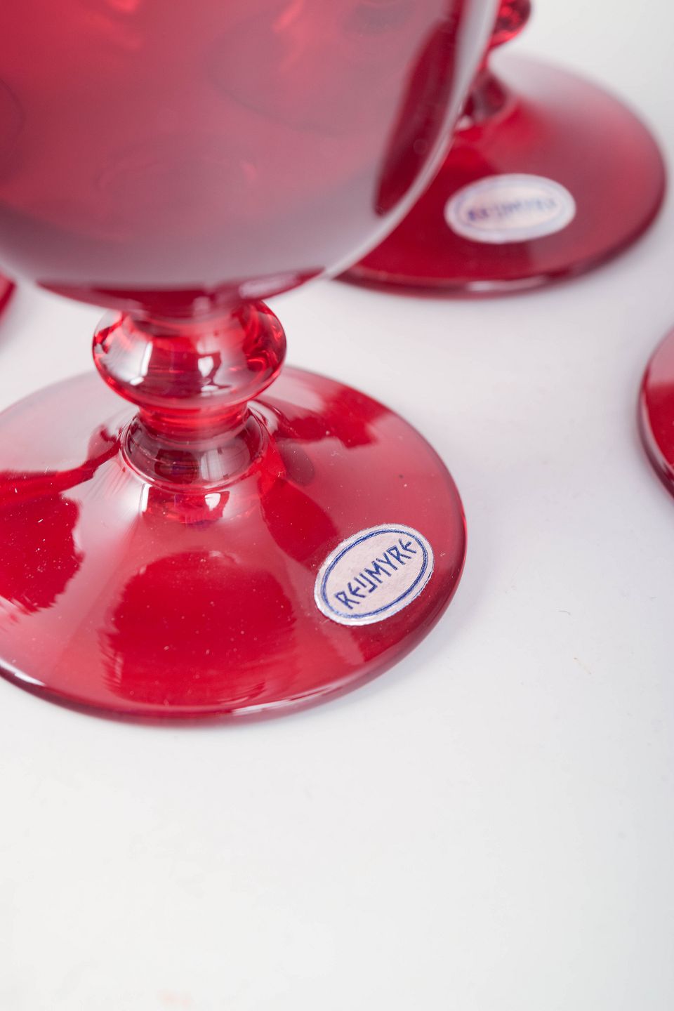 Sæt af fire rubinrøde portvinsglas i klassisk form med rund kupa og profileret stilk. Ét glas med originalt Reijmyre-klistermærke.