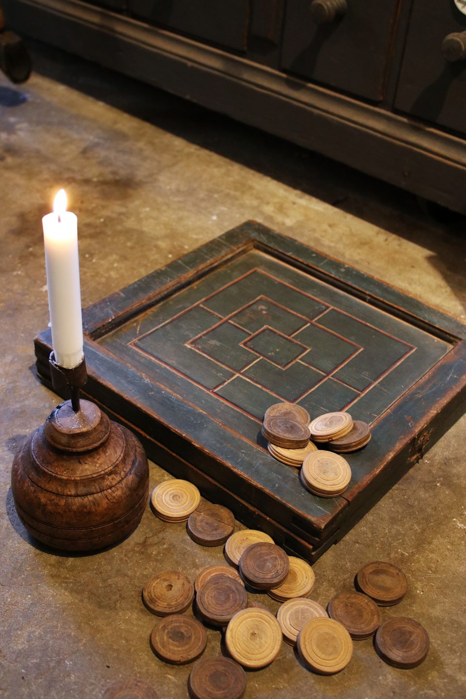 Charmerende antik 1800 tals spilleæske / brætspil i bemalet træ med 3 forskellige spil. Har en super fin patina.
