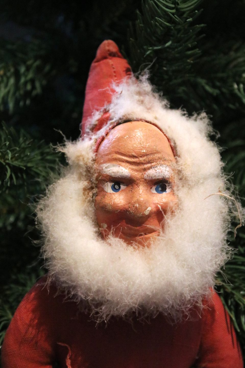 Fin , gammel julemand med krop i rødt stof med bemalet papmache ansigt og skæg af dun...