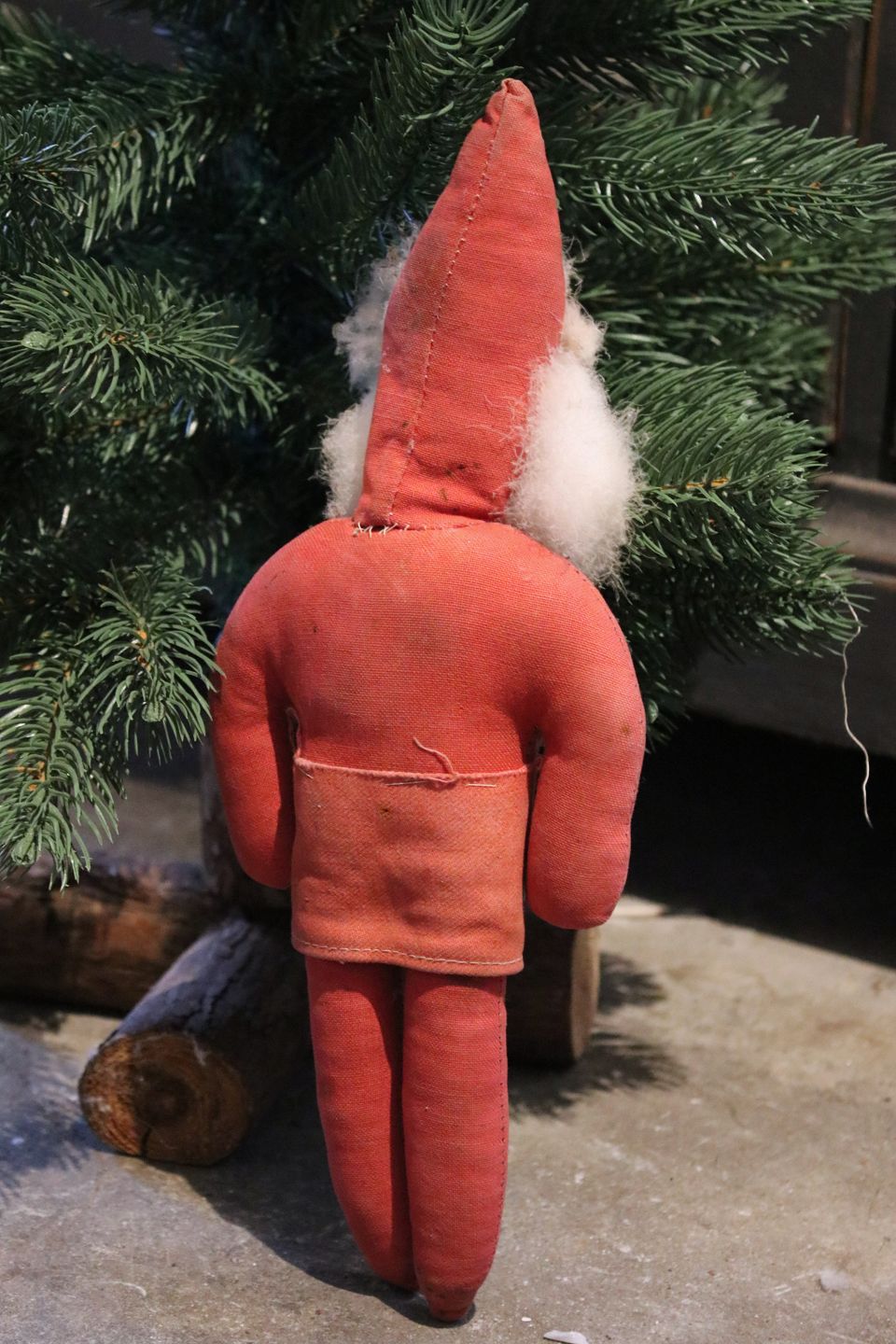 Fin , gammel julemand med krop i rødt stof med bemalet papmache ansigt og skæg af dun. H: 30cm.