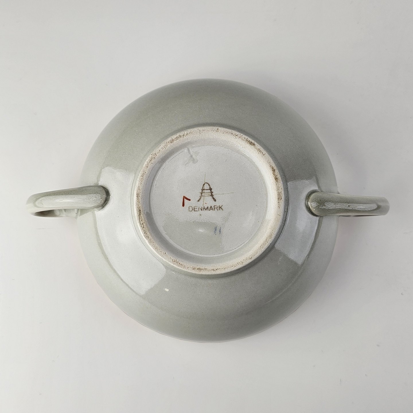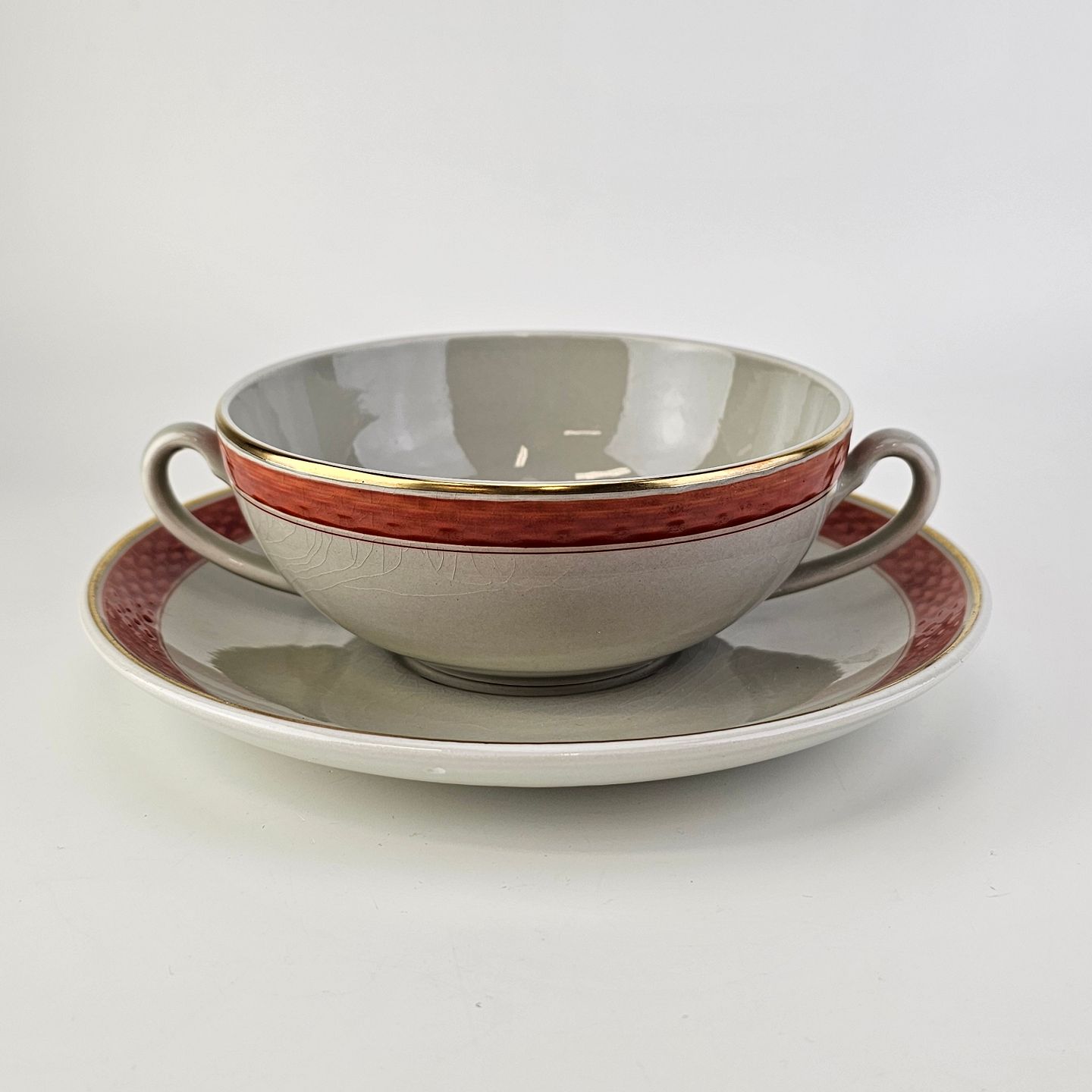 Tureby er stel i fajance dekoreret med rødt bånd og guldkant