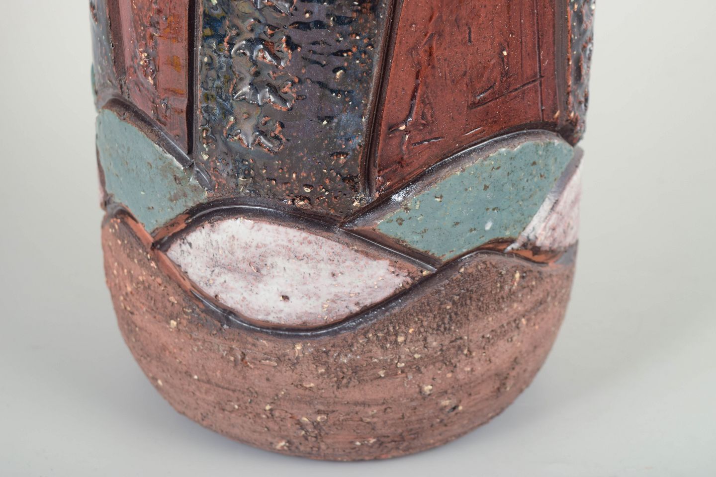 Imponerende chamotte-gulvvase med kraftigt modelleret relief og dekorativ glasur i rødbrune, blå, turkise og hvide nuancer. Forsiden prydes af stiliserede, opstigende drageformer – et karakteristisk motiv for Zawadzkis arbejde i 1960’erne.