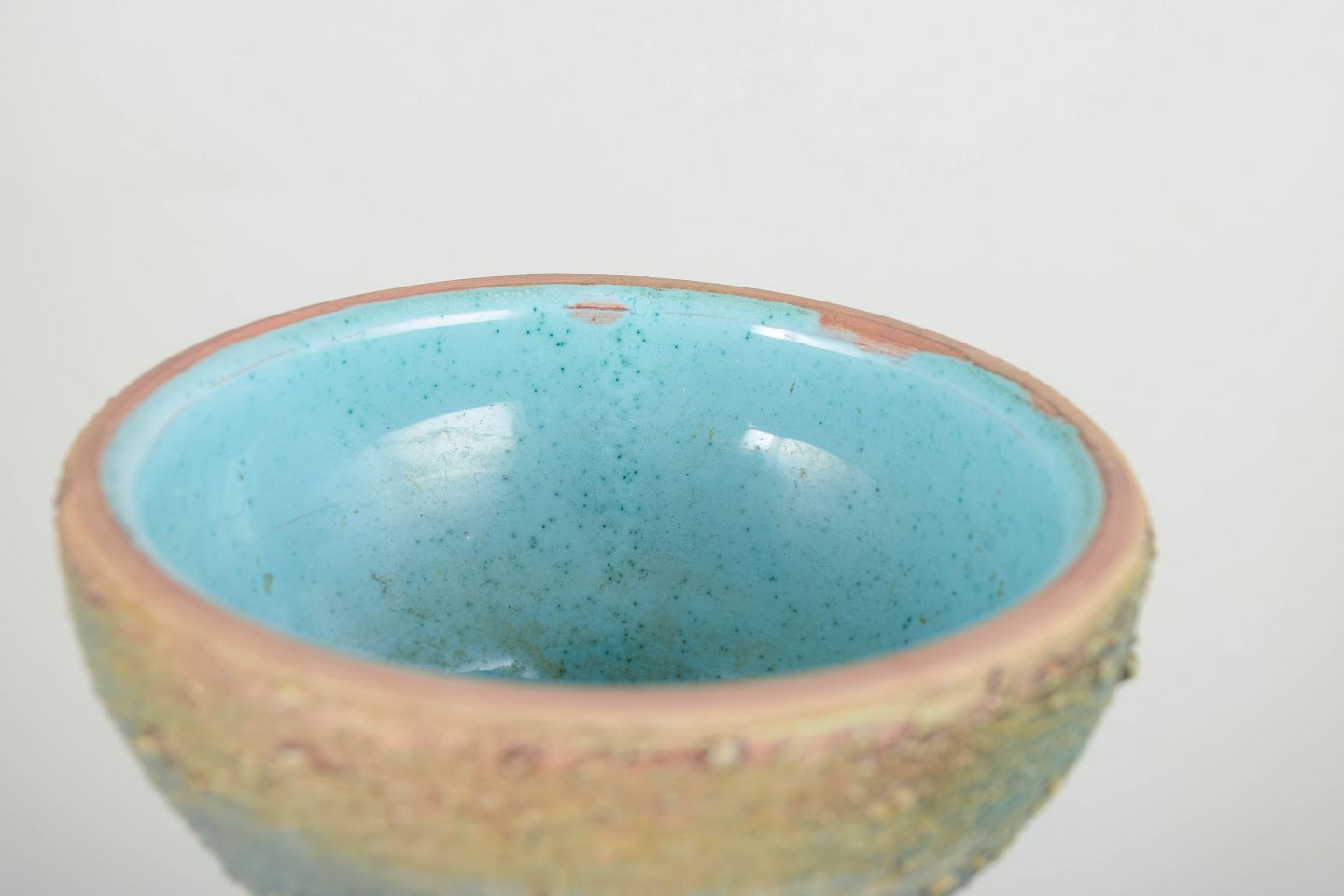 Ekstremt dekorativ og høj cylindrisk gulvvase i chamotte-ler med rillet overflade og karakteristisk inciseret dekoration af stiliseret fugl og blomster. Glasur i blå, grønne og sandfarvede nuancer.