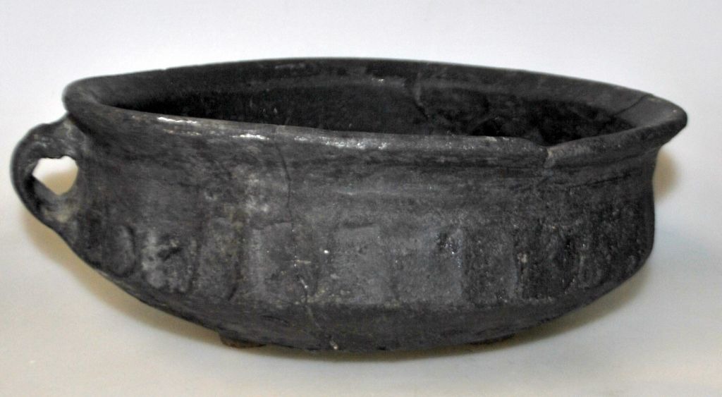Keltisk jernalder, Øreskål. Danmark. Jordfund. Med dekoration på siderne. Sort ler. Med tre små ben. Repareret. Dia.: 22 cm. H: 9 cm.