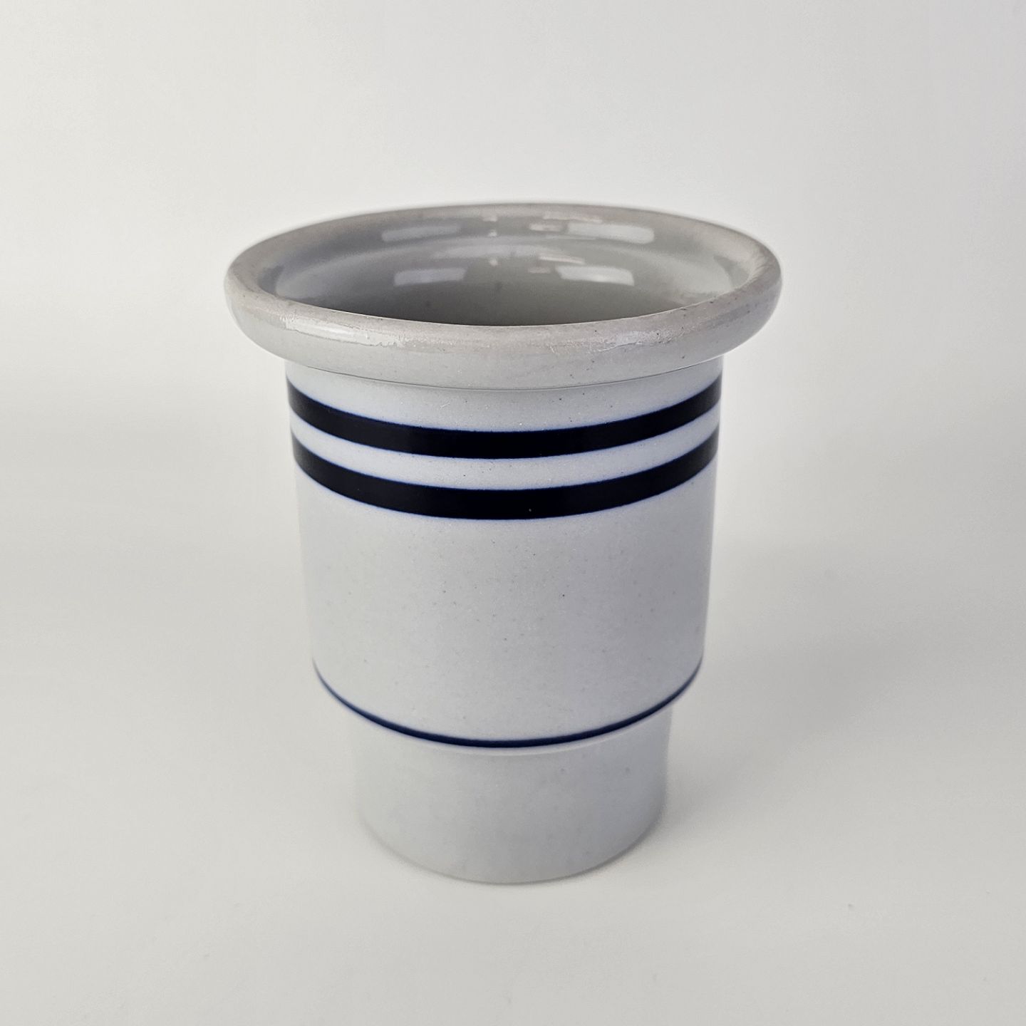 Krukke i glaseret stentøj med dekoration af tre blå striber