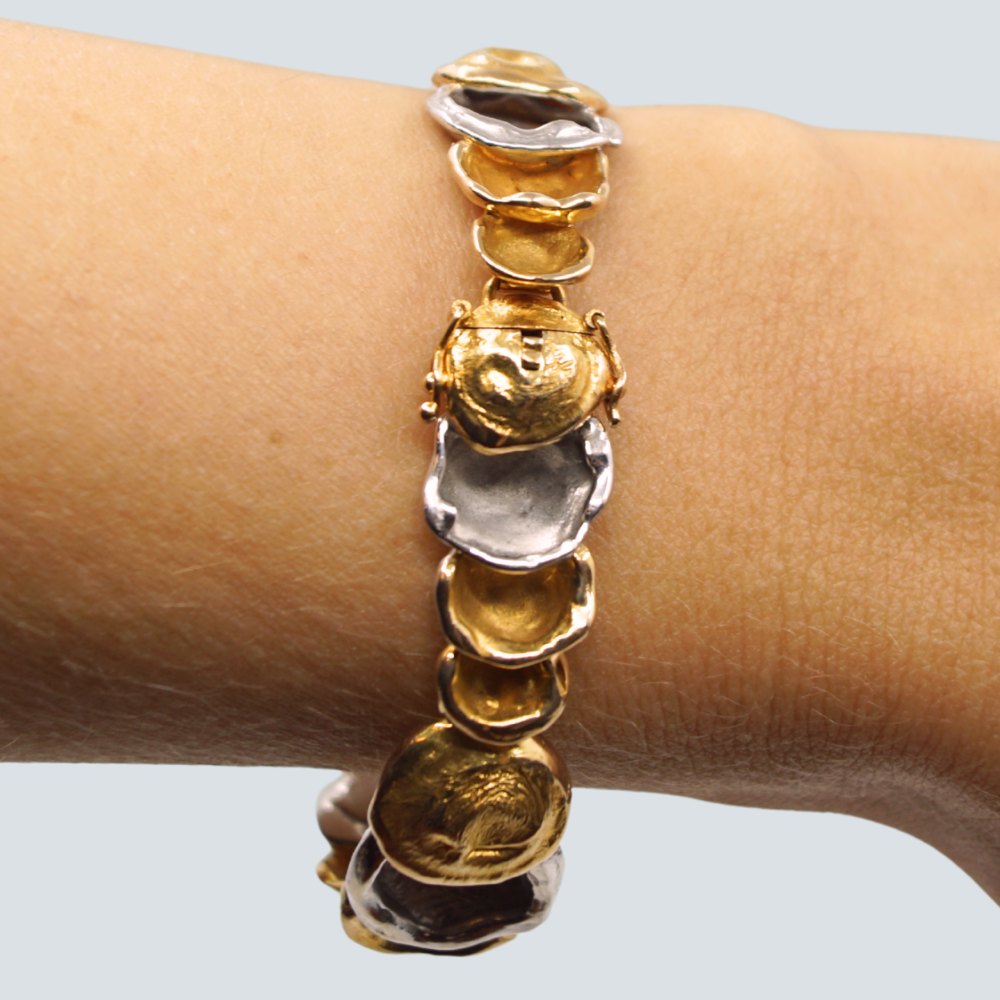 Carl Antonsen; Armbånd sammensat af led i 14 kt. guld og hvidguld. Med kasselås og to sikkerhedslåse.