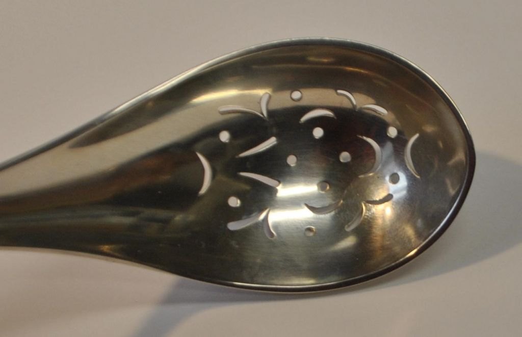 Hans Hansen sterling is ske, 20. årh. Kolding, Danmark. Med huldekorationer i laf. Stemplet: Hans Hansen 925 sterling Denmark. L. 17,5 cm. Vægt: 64 gram.