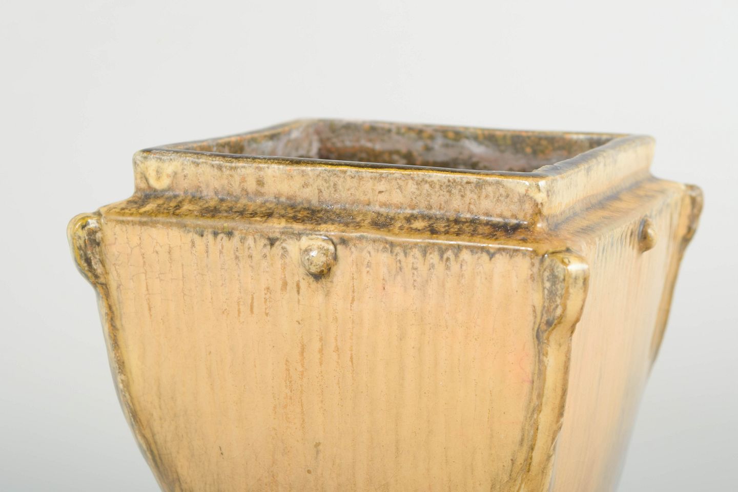 Karakteristisk vase af Svend Hammershøi for Kähler, udført i 1920/30’erne. Formen er firkantet med let rundede sider og diskrete knopdetaljer ved hjørnerne. Den vertikale rifling og den varme gulbrune glasur er typiske for Hammershøis arbejder i denne periode.