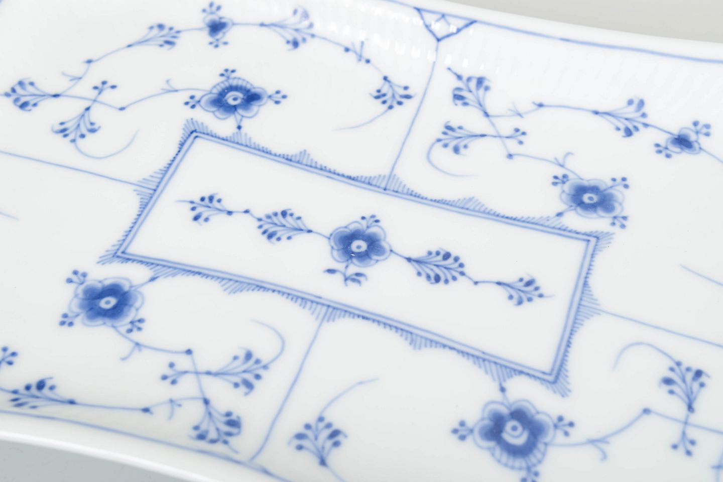 Elegant rektangulær bakke i musselmalet riflet porcelæn, med blødt svungne kanter og klassisk håndmalet koboltblå dekoration på riflet korpus. En smuk og sjældnere form fra Royal Copenhagens tidlige 1900-tals produktion.