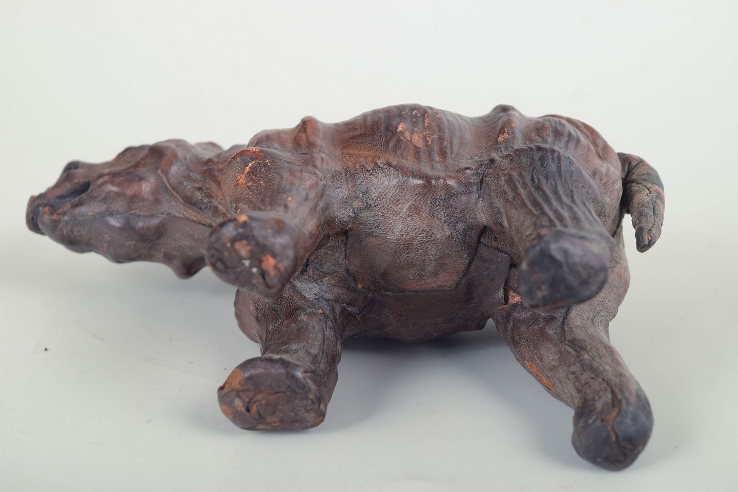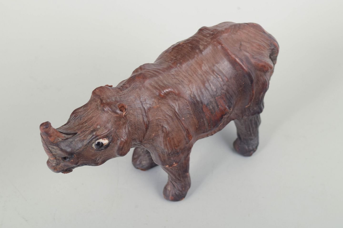 Håndlavet næsehornsfigur udført i formet og syet læder, muligvis forhandlet gennem Liberty & Co., London. Figuren har detaljeret modellerede træk, glasøjne og en mørk patineret overflade, der fremhæver dens håndværksmæssige udtryk.
