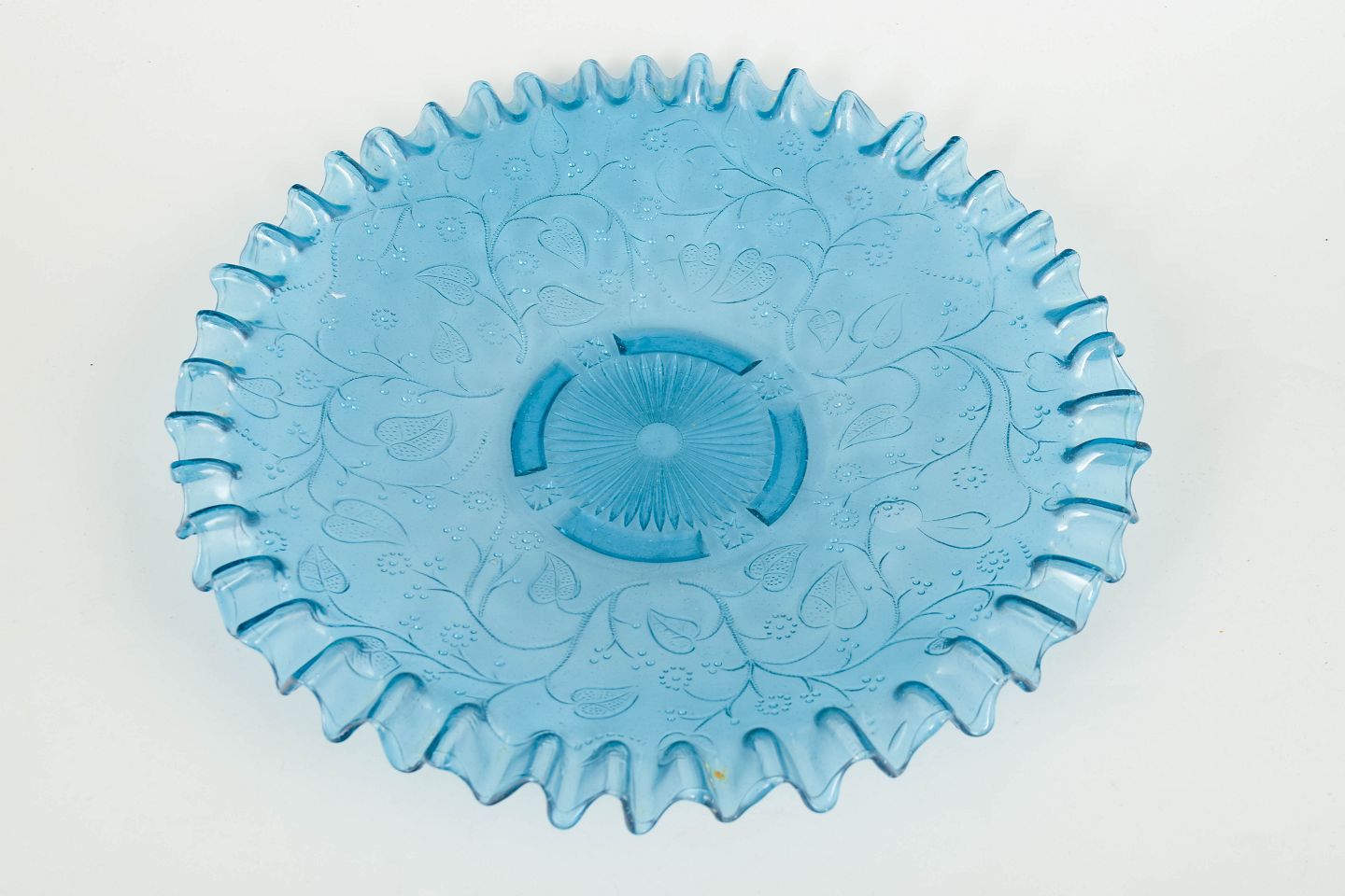 Dekorativt glasfad i lyseblå presset glas med bølget kant og indpresset blomster- og rankemønster. Et typisk eksempel på nordisk glasproduktion fra perioden, hvor funktionelle hverdagsgenstande blev udformet med markant ornamental finesse.