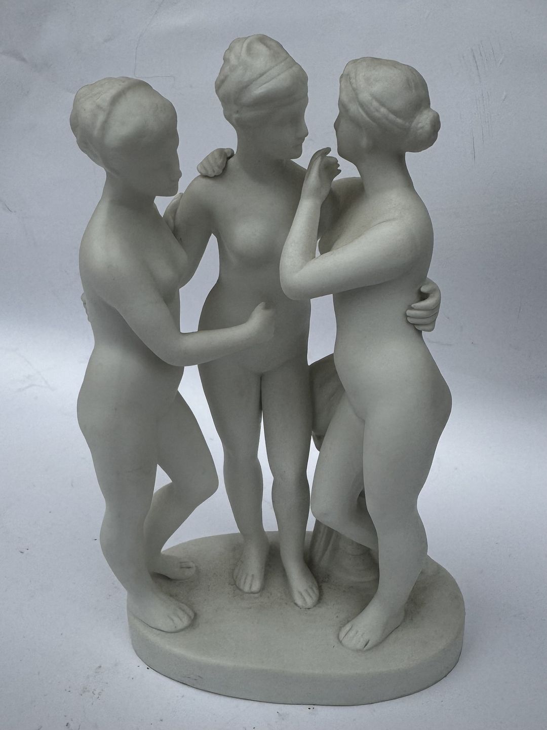 Design Bertel Thorvaldsen: De tre gratier i Bisquit porcelæn. I god stand. Ikke fabriksmærket. Formodes den er fremstillet på ukendt tysk fabrik. H. 18,3 cm