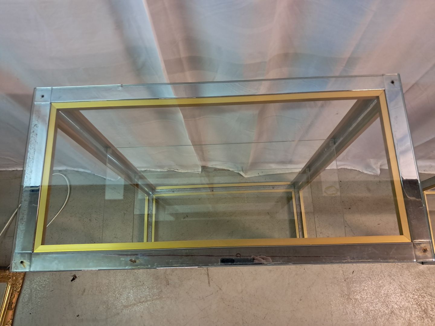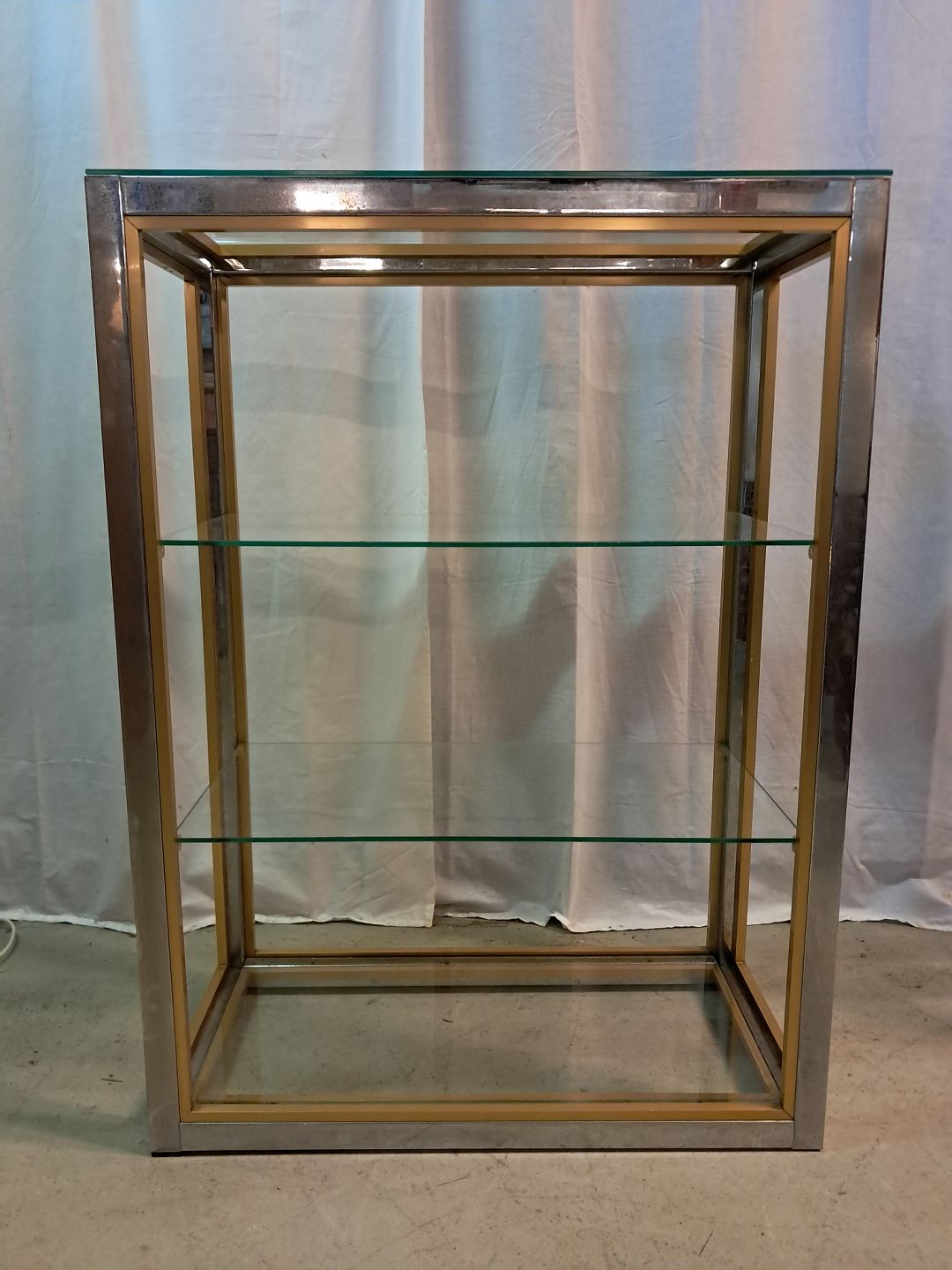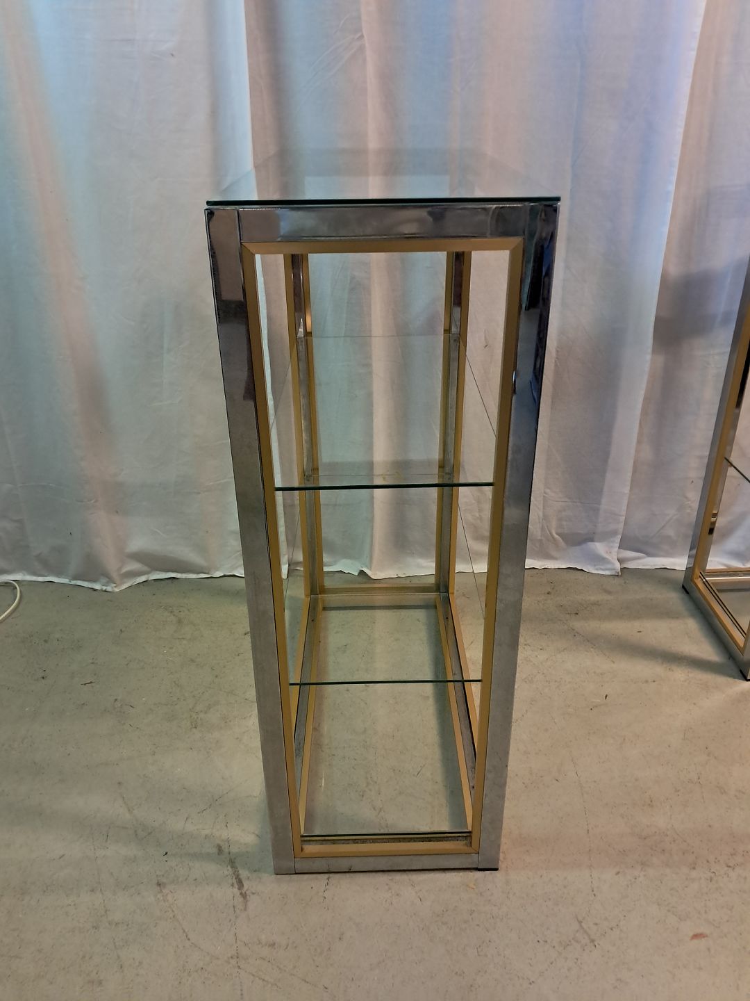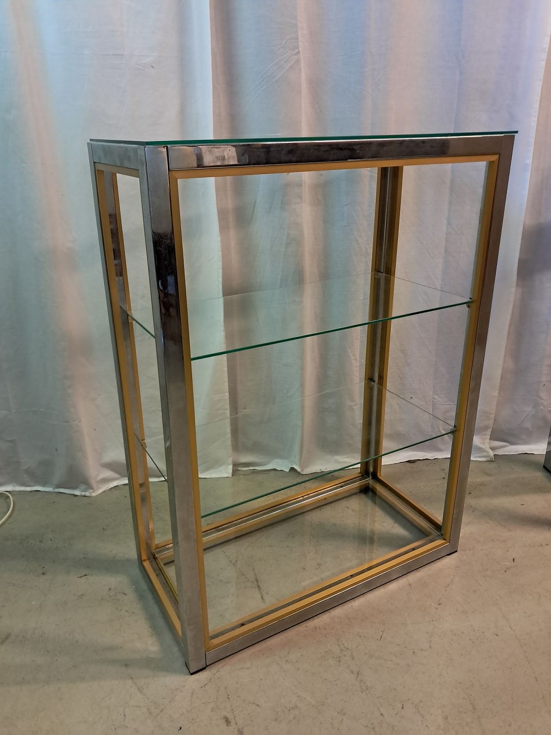 Forkromet reol i metal med glashylder, fra 1980erne.