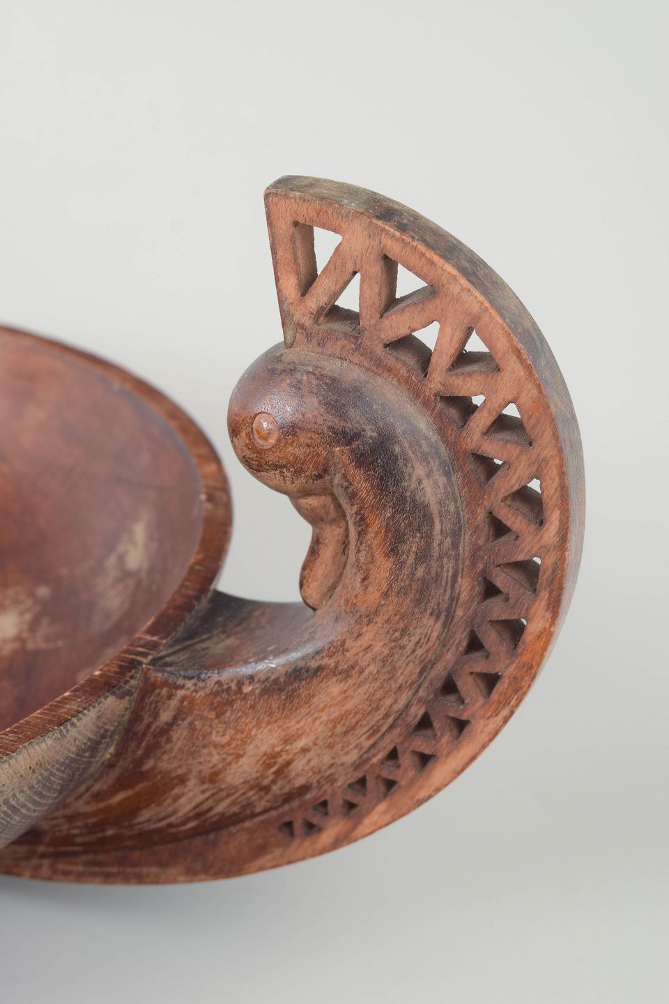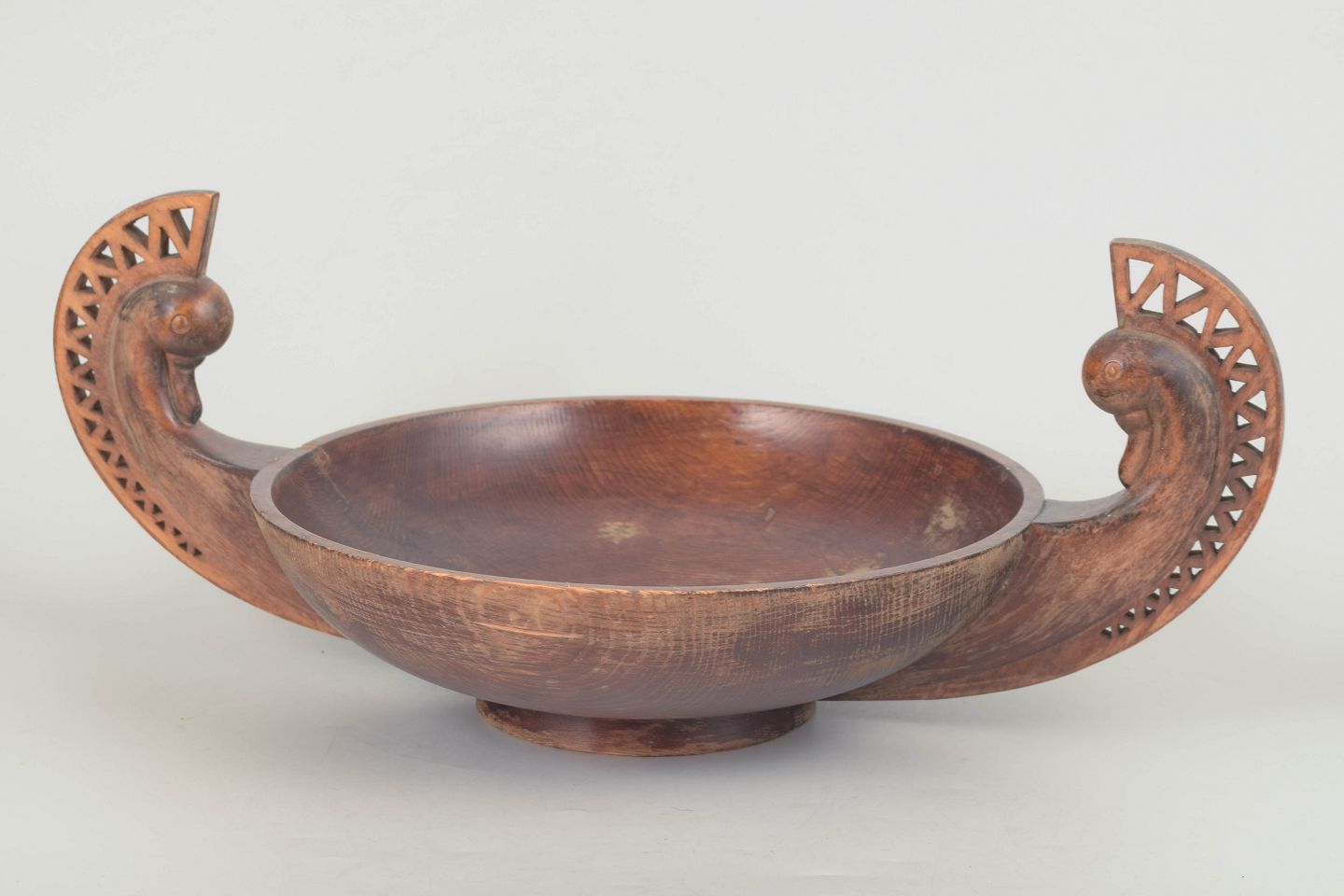 Dekorativ, håndudskåret træskål med karakteristiske dobbeltstående fuglehoveder i hver side – et motiv stærkt forbundet med Kalevala Korus tidlige formsprog. Den varme patina og de fint gennembrudte detaljer understreger Paaers særlige evne til at forene nordisk ornamentik med funktionelt kunsthåndværk. Signeret.