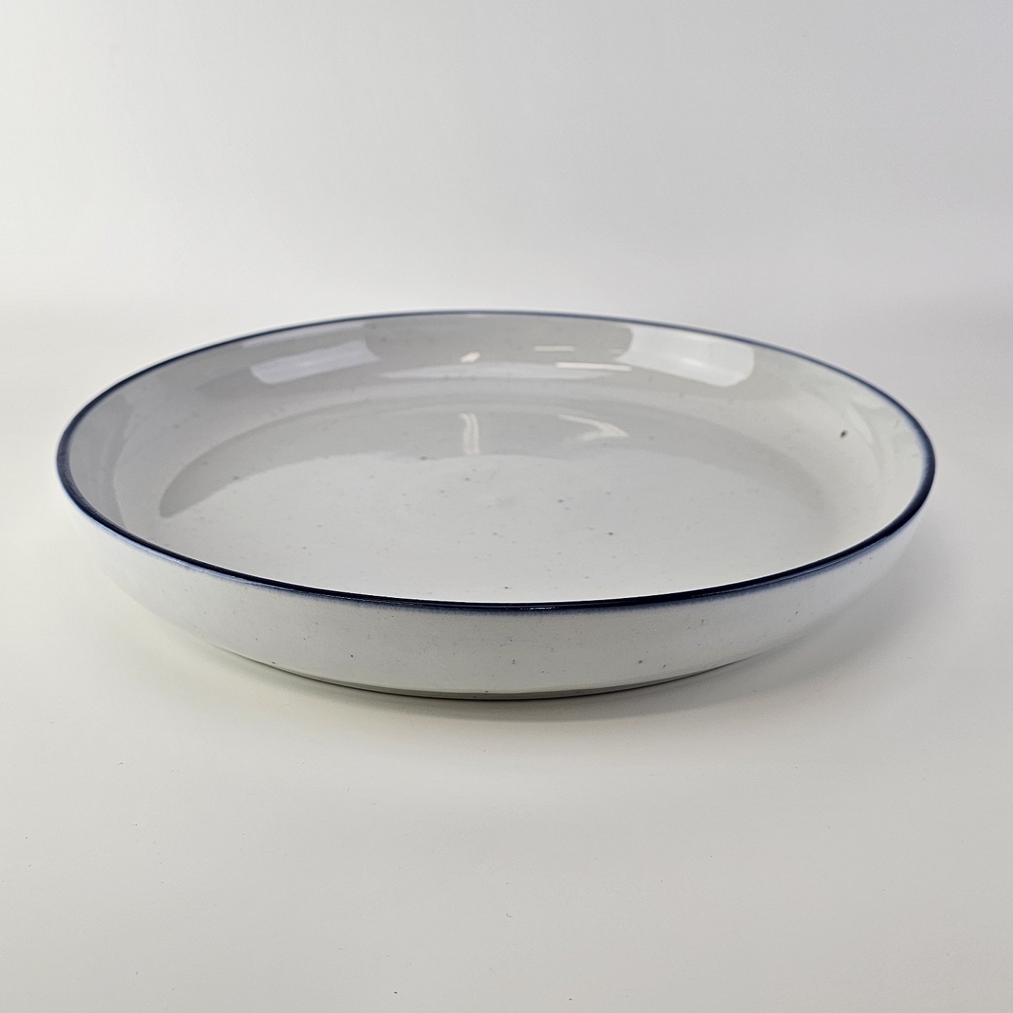 Rundt fad i stentøj med blå kant, jernpletter og hvid glasur