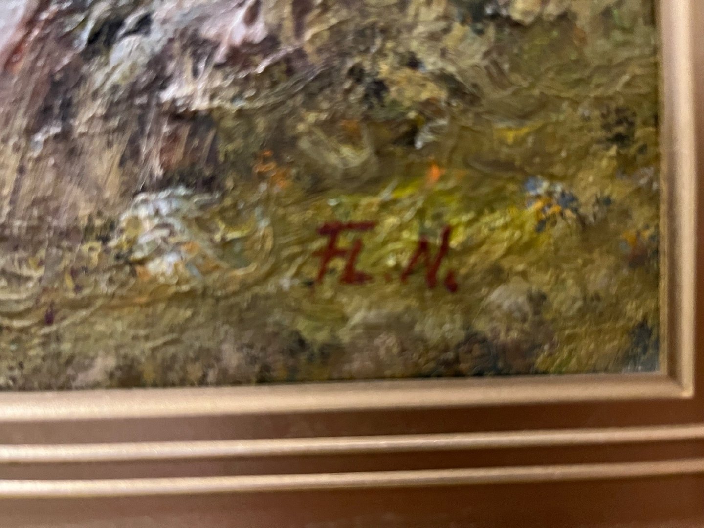 Oliemaleri af FL.N, der skildrer en dramatisk klippekyst med vegetation og hav, udført i en realistisk til let impressionistisk stil. Værket er indrammet i en elegant guldramme.