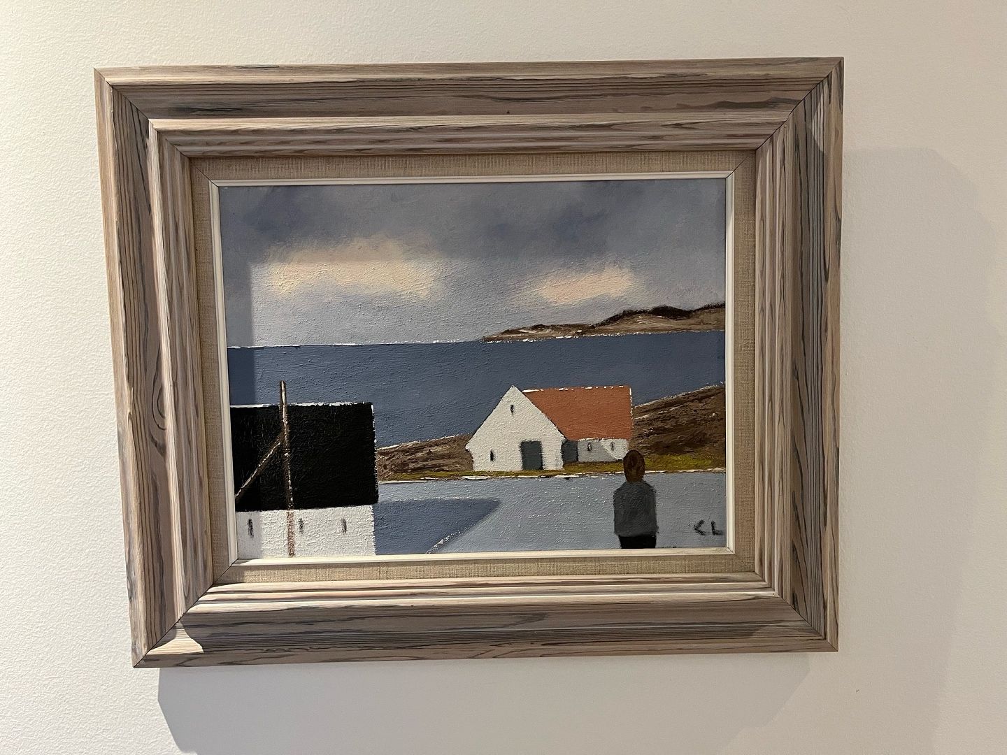 Motiv: Motiverne omfatter ofte kystlandskaber – muligvis fra Bornholm – med hvidkalkede huse og markante farver som røde tage og mørke himmelpartier, som det fremgår af det aktuelle værk.