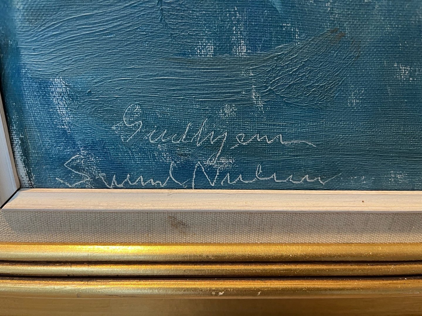 Oliemaleri af Svend Nielsen i guldramme, forestillende en vinterscene med bygninger og figurer.